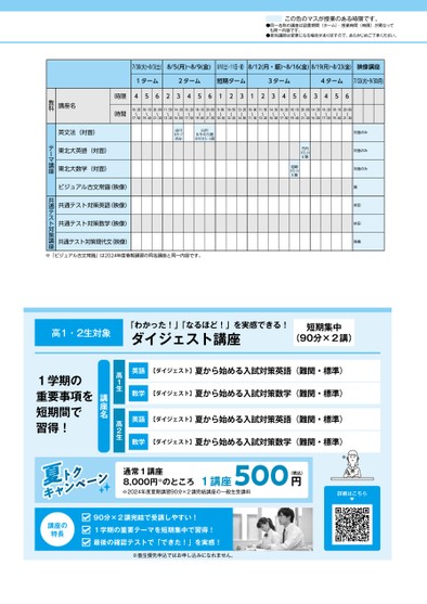 この色のマスが授業のある時限です。●同一名称の講座は設置期間(ターム)・授業時間(時限)が異なっても同一内容です。●担当講師は変更になる場合がありますので、あらかじめご了承ください。7/30(火)~8/3(土)8/5(月)~8/9(金)8/10(土)・11日・祝)8/12(月・振)~8/16(金)8/19(月)~8/23(金)映像講座1ターム2ターム短期ターム3ターム4ターム7/23(火)~9/30(月)45623456123123456345616:20〜17:5018:10〜19:4020:00〜21:3011:50〜13:2014:30〜16:0016:20〜17:5018:10〜19:4020:00〜21:309:00〜10:3010:50〜12:2013:20〜14:5010:00〜11:3011:50〜13:2014:30〜16:0016:20〜17:5018:10〜19:4020:00〜21:3014:30〜16:0016:20〜17:5018:10〜19:4020:00〜21:30時限時間講座名教科山川8/5〜7のみ山川8/9の5限8/10の5・6限竹内8/12〜146限岩崎8/12〜145限対面のみ対面のみ対面のみ園柴田依田高橋英文法(対面)東北大英語(対面)東北大数学(対面)ビジュアル古文常識(映像)共通テスト対策英語(映像)共通テスト対策数学(映像)共通テスト対策現代文(映像)テーマ講座共通テスト対策講座※「ビジュアル古文常識」は2024年度春期講習の同名講座と同一内容です。高1・2生対象「わかった!」「なるほど!」を実感できる!ダイジェスト講座短期集中(90分×2講)英語【ダイジェスト】夏から始める入試対策英語(難関・標準)数学【ダイジェスト】夏から始める入試対策数学(難関・標準)英語【ダイジェスト】夏から始める入試対策英語(難関・標準)数学【ダイジェスト】夏から始める入試対策数学(難関・標準)高1生高2生講座名1学期の重要事項を短期間で習得!通常1講座8,000円※のところ1講座500(税込)円※2024年度夏期講習90分×2講完結講座の一般生受講料詳細はこちら▶講座の特長90分×2講完結で受講しやすい!1学期の重要テーマを短期集中で習得!最後の確認テストで「できた!」を実感!※塾生優先申込ではお申し込みになれません。●2024年度/夏期講習/東北/仙台/高2生/パターン14252024_56_2_251_32_20240401175008.csv/2ページ校了時削除