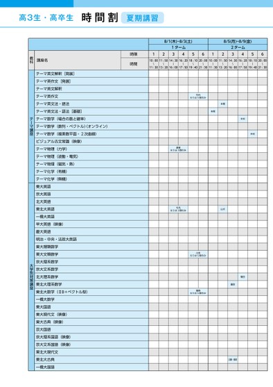 8/1(木)~8/3(土)8/5(月)~8/9(金)1ターム341256122ターム345610:0011:5014:3016:2018:1020:0010:0011:5014:3016:2018:1020:00〜〜〜〜〜〜〜11:3013:2016:0017:5019:4021:3011:3013:2016:0017:5019:4021:30〜〜〜〜〜竹内8/3は5限のみ本間本間木村木村渡部8/3は3限のみ竹内8/3は3限のみ山川小林8/3は5限のみ塩飽8/3は5限のみ福田重政近藤・服部時限時間テーマ英文解釈[発展]テーマ英作文[発展]テーマ英文解釈テーマ英作文テーマ英文法・語法テーマ英文法・語法[基礎]テーマ数学(場合の数と確率)テーマ数学(数列・ベクトル)オンライン)テーマ数学(複素数平面・2次曲線)ビジュアル古文常識(映像)テーマ物理(力学)テーマ物理(波動・電気)テーマ物理(磁気・熱)テーマ化学(有機)テーマ化学(無機)東大英語京大英語北大英語東北大英語一橋大英語早大英語(映像)慶大英語明治・中央・法政大英語東大理類数学東大文類数学京大理系数学京大文系数学北大理系数学東北大理系数学東北大数学(ⅡB+ベクトル型)一橋大数学東大国語東大現代文(映像)東大古典(映像)京大国語京大理系国語(映像)京大文系国語(映像)東北大現代文東北大古典一橋大国語テーマ講座大学別対策講座講座名教科●2024年度/夏期講習/東北/仙台/高3・卒生/パターン26402024_56_2_251_11_20240517143643.csv/2ページ校了時削除高3生・高卒生時間割夏期講習