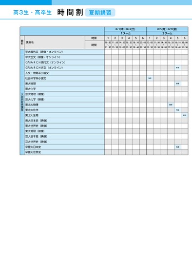 8/1(木)~8/3(土)8/5(月)~8/9(金)1ターム341256122ターム345610:0011:5014:3016:2018:1020:0010:0011:5014:3016:2018:1020:00〜〜〜〜〜〜〜11:3013:2016:0017:5019:4021:3011:3013:2016:0017:5019:4021:30〜〜〜〜〜池田隼坂渡部渡部寺田唐牛佐藤時限時間早大現代文(映像・オンライン)早大古文(映像・オンライン)GMARCH現代文(オンライン)GMARCH古文(オンライン)人文・教育系小論文社会科学系小論文東大物理東大化学京大物理(映像)京大化学(映像)東北大物理東北大化学東北大生物東大日本史(映像)東大世界史(映像)東大地理(映像)京大日本史(映像)京大世界史(映像)早慶大日本史早慶大世界史大学別対策講座講座名教科高3生・高卒生時間割夏期講習●2024年度/夏期講習/東北/仙台/高3・卒生/パターン26402024_56_2_251_11_20240402102404.csv/3ページ校了時削除