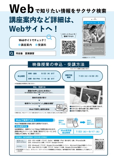 で知りたい情報をサクサク検索Web講座案内など詳細は、Webサイトへ!スマートフォンで簡単アクセス夏期講習(高校生・高卒生)ログインお気に入りカート高校生・高卒生第一志望大学合格をめざす高校生・高卒生のための短期集中講座今、知っておくべき要点を、わずか4日間で集中攻略。新学期以降の学習をスムーズに進められるように、この春、河合塾で始めよう!※画面はイメージです。映像授業の申込・受講方法※オンライン授業とは異なります。視聴可能期間7/23(火)〜9/30(月)Webサイトでチェック!●講座案内●受講料河合塾夏期講習申込期間新規・追加8/22(木)まで変更・取りやめ7/19(金)まで*対象講座は時間割をご覧ください。申込・受講方法講座のお申し込みとお支払い他の夏期講習の講座と同様にお申し込みください。教材のお受け取り専用サイトにログインし講義を視聴※Webで質問し疑問を解消※視聴方法は、申込マイページの「各種ご案内ダウンロード」から「受講上のご案内」などをご確認ください。●自分のスケジュールにあわせて受講できます。●わからない部分は繰り返し視聴できます。●自宅での視聴も可能です。Webで質問できる!Webで映像授業の内容に関する質問ができます。Web質問方法質問書を撮影しデータ送信カシャ!回答がWebで確認できる右記期間内に、専用サイトにてWebで質問を受け付けます。詳細は申込マイページの「各種ご案内ダウンロード」から「受講上のご案内」をご確認ください。Web質問書提出期間7/23(火)〜9/17(火)対応端末・動作推奨環境(2024年3月現在)タブレット/スマートフォン【OS:iOS14以降】ブラウザ:Safari推奨機種:iPad(第4世代)以降、iPhone5s以降【OS:Android9.x以降】ブラウザ:GoogleChromeパソコン【OS:Windows】ブラウザ:GoogleChromeの最新バージョン、MicrosoftEdgeの最新バージョン【OS:MacOSⅩ10.11以降】ブラウザ:Safari11以降、GoogleChromeの最新バージョン※OSの将来バージョン、タブレット/スマートフォンの新機種などの対応は、動作確認が完了次第、推奨環境としてご案内していきます。詳細はこちら▼