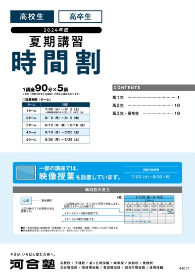 高校生高卒生2024年度夏期講習1講座90分×5講※形式(授業分数または講数)の異なる講座もあります。◎設置期間(ターム)ターム1ターム2ターム3ターム4ターム5ターム日程7/30(火)〜8/※岡崎現役館のみ7/29(月)〜8/2(金)3(土)8/5(月)〜8/9(金)8/12(月・振)〜8/16(金)8/19(月)〜8/23(金)8/26(月)〜8/28(水)CONTENTS高1生高2生…………………………………1………………………………10高3生・高卒生……………………19一部の講座では、映像授業も設置しています。視聴可能期間7/23(火)〜9/30(月)山田担当講師上記の色のマスが授業のある時限です。時間割の見方(例)この講座は8/12・8/13の2日間で完結します。授業は3タームの6限です。3タームの1・2限が授業です。3タームの3限が授業です。●同一名称の講座は設置校舎・設置期間(ターム)・授業時間(時限)が異なっても同一内容です。●担当講師は変更になる場合がありますので、あらかじめご了承ください。8/12(月・振)〜8/16(金)3ターム3413:4015:1015:3017:00517:2018:50619:1020:40松原8/12・13の2日間19:1010:40211:0012:30池田畑中・阪上・杉井名駅校/千種校/星ヶ丘現役館/岐阜校/浜松校/豊橋校刈谷現役館/岡崎現役館/豊田現役館/四日市現役館/津現役館44017