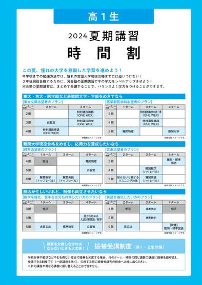 高1生2024夏期講習時間割この夏、憧れの大学を意識した学習を進めよう!中学校までの勉強方法では、憧れの志望大学現役合格までには追いつけない!2年後現役合格するために、河合塾の夏期講習で今の学力をレベルアップさせよう!河合塾の夏期講習は、まとめて受講することで、バランスよく学力をつけることができます。東大・京大・医学部など最難関大学・学部をめざすなら【東大文類志望者のプラン】【医学部医学科志望者のプラン】ターム時限2ターム2限3限4限自習室特別選抜英語(ONEWEX)3ターム特別選抜国語(ONEWEX)特別選抜数学(ONEWEX)時間割はイメージです。ターム時限1ターム3ターム4ターム3限4限5限特別選抜数学中高一貫(ONEWEX)特別選抜英語(ONEWEX)難関物理難関化学時間割はイメージです。難関大学現役合格をめざし、応用力を養成したいなら【理系志望者のプラン】【文系志望者のプラン】ターム時限1ターム3ターム4限5限6限部活難関数学(トップレベル)難関英語(トップレベル)4ターム難関物理自習室ターム時限2ターム3ターム3限4限5限難関数学(ハイレベル)知らないと損するリスニング対策難関英語(ハイレベル)4ターム難関・標準国語時間割はイメージです。時間割はイメージです。部活が忙しいけれど、勉強も両立させたいなら【数学を強化、苦手な古文も対策したい方のプラン】【英語を強化したい方のプラン】ターム時限1ターム3ターム4タームターム時限2ターム3限4限5限部活夏から始める入試対策英語/数学古典文法標準数学自習室時間割はイメージです。4限5限6限部活英文法4ターム部活3ターム標準英語標準数学【映像】難関・標準国語時間割はイメージです。授業を欠席しなければならないときも大丈夫!振替受講制度〈高1・2生対象〉学校行事や部活などやむを得ない理由で授業を欠席する場合、他のターム・時限の同じ講数の講座に授業を振り替え、受講できる制度です(一部講座を除く)。欠席する前に振替受講先の校舎へお申し出ください。※別の講座や異なる講数に振り替えることはできません。