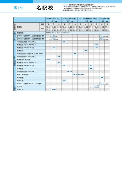高1生名駅校この色のマスが授業のある時限です。●同一名称の講座は設置校舎・設置期間(ターム)・授業時間(時限)が異なっても同一内容です。●担当講師は変更になる場合がありますので、あらかじめご了承ください。映像授業は69・70ページをご覧ください。7/30(火)~8/3(土)8/5(月)~8/9(金)8/12(月・振)~8/16(金)8/19(月)~8/23(金)1ターム2ターム45645633ターム4564ターム4515:3017:2019:1015:3017:2019:1013:4015:3017:2019:1015:3017:2017:0018:5020:4017:0018:5020:4015:1017:0018:5020:4017:0018:50〜〜〜〜〜〜〜〜〜〜〜〜時限時間講座名講座種類教科映像授業【ダイジェスト】夏から始める入試対策英語(難関・標準)【ダイジェスト】夏から始める入試対策数学(難関・標準)特別選抜英語(ONEWEX)難関英語(トップレベル)難関英語(ハイレベル)標準英語特別選抜数学中高一貫(ONEWEX)特別選抜数学(ONEWEX)難関数学中高一貫難関数学(トップレベル)難関数学(ハイレベル)標準数学特別選抜国語(ONEWEX)難関・標準国語難関物理難関化学知らないと損するリスニング対策英文法古典文法映像授業の一覧は、69・70ページをご参照ください。松岡8/1・2の2日間小倉7/30・31の2日間宮下山田(龍)小倉大上井上(摩)室田加藤花田宮下8/21・22の2日間加藤8/19・20の2日間松岡深津笠井野村坂口水嶋高橋・山村平野・笹森武下・鈴木(孝)西浦宮下8/19・20の2日間金井8/12〜14の3日間映像ダイジェストセット総合レベル別講座テーマ講座●2024年度/夏期講習/中部/名駅校/高1生/パターン12452024_56_4_414_31_20240325113257.csv/1ページ校了時削除