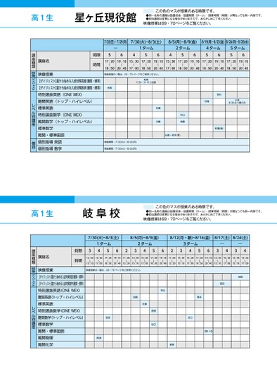 高1生星ヶ丘現役館この色のマスが授業のある時限です。●同一名称の講座は設置校舎・設置期間(ターム)・授業時間(時限)が異なっても同一内容です。●担当講師は変更になる場合がありますので、あらかじめご了承ください。映像授業は69・70ページをご覧ください。7/28(日)・7/29(月)7/30(火)~8/3(土)8/5(月)~8/9(金)8/19(月)~8/23(金)8/26(月)~8/28(水)―1ターム2ターム564564564ターム565ターム5617:2019:1015:3017:2019:1015:3017:2019:1017:2019:1017:2019:10〜〜〜〜〜〜〜〜〜〜〜〜18:5020:4017:0018:5020:4017:0018:5020:4018:5020:4018:5020:40映像授業の一覧は、69・70ページをご参照ください。松岡7/30・31の2日間水嶋笹村松岡山本8/28は5眼のみ村瀬(竜)村瀬水嶋杉山斉藤日嵩・鈴木(孝)実施期間:7/30(火)〜8/26(月)実施期間:7/30(火)〜8/26(月)講座名時限時間映像授業【ダイジェスト】夏から始める入試対策英語(難関・標準)【ダイジェスト】夏から始める入試対策数学(難関・標準)特別選抜英語(ONEWEX)難関英語(トップ・ハイレベル)標準英語特別選抜数学(ONEWEX)難関数学(トップ・ハイレベル)標準数学難関・標準国語個別指導英語個別指導数学講座種類教科映像総合ダイジェストセットレベル別講座個別高1生岐阜校この色のマスが授業のある時限です。●同一名称の講座は設置校舎・設置期間(ターム)・授業時間(時限)が異なっても同一内容です。●担当講師は変更になる場合がありますので、あらかじめご了承ください。映像授業は69・70ページをご覧ください。7/30(火)~8/3(土)7/30(火)~8/3(土)8/5(月)~8/9(金)8/5(月)~8/9(金)812(月・振)~8/16(金)8/17(土)8/12(月・振)~8/16(金)1ターム1ターム2ターム2ターム3ターム3ターム―8/24(土)8/24(土)ーー3時限456234562345634343413:40〜15:1015:30時間〜17:0017:20〜18:5019:101〜20:40111:00〜12:3013:401〜15:1015:30〜17:0017:20〜18:5019:10〜20:4011:00〜12:3013:40〜15:1015:30〜17:0017:20〜18:5019:10〜20:4013:40〜15:1015:30〜17:0013:40〜15:1015:30〜17:0013:40〜15:1015:30〜17:00時限時間講座名教科講座名講座種類教科岩崎宮田宮田岩崎岩崎永瀬市位市位永瀬岩崎西畑谷口西畑谷口青木青木谷口谷口佐藤・大田佐藤・大田若原若原宮田宮田西浦西浦映像授業【ダイジェスト】夏から始める入試対策英語(難関・標準)【ダイジェスト】夏から始める入試対策数学(難関・標準)特別選抜英語(ONEWEX)難関英語(トップ・ハイレベル)標準英語特別選抜数学(ONEWEX)難関数学(トップ・ハイレベル)標準数学難関・標準国語難関物理難関化学映像授業【ダイジェスト】から始める入試対策英語(難関・標準)【ダイジェスト】から始める入試対策数学(難関・標準)特別選抜語(ONEWEX)語(トップ・ハイレベル)標準英語特別選抜数学(ONEWEX)学(トップ・ハイレベル)標準数学難関・標準国語難関物理難関化学レベル別講座セット総合映像総合ダイジェストットレベル別講座映像授業の一覧は、69・70ページをご参照ください。映像授業一覧は、9・70ペご参照ください。●2024年度/夏期講習/中部/星ヶ丘/高1生/パターン12452024_56_4_439_31_20240328152029.csv/1ページ校了時削除