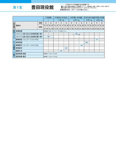 高1生豊田現役館この色のマスが授業のある時限です。●同一名称の講座は設置校舎・設置期間(ターム)・授業時間(時限)が異なっても同一内容です。●担当講師は変更になる場合がありますので、あらかじめご了承ください。映像授業は69・70ページをご覧ください。7/29(月)7/30(火)~8/3(土)8/5(月)~8/9(金)8/12(月・振)~8/16(金)8/19(月)~8/23(金)―1ターム2ターム564564563ターム564ターム5618:1020:0016:2018:1020:0016:2018:1020:0018:1020:0018:1020:0019:4021:3017:5019:4021:3017:5019:4021:3019:4021:3019:4021:30〜〜〜〜〜〜〜〜〜〜〜〜時限時間講座名講座種類教科映像授業【ダイジェスト】夏から始める入試対策英語(難関・標準)【ダイジェスト】夏から始める入試対策数学(難関・標準)難関英語(トップ・ハイレベル)標準英語難関数学(トップ・ハイレベル)標準数学難関化学個別指導英語個別指導数学映像授業の一覧は、69・70ページをご参照ください。山本8/7・8の2日間加藤山本渡部加藤河合若原実施期間:7/30(火)〜8/26(月)実施期間:7/30(火)〜8/26(月)映像ダイジェストセット総合レベル別講座個別●2024年度/夏期講習/中部/豊田/高1生/パターン12452024_56_4_449_31_20240328151844.csv/1ページ校了時削除