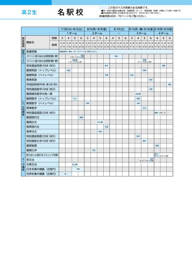 高2生名駅校この色のマスが授業のある時限です。●同一名称の講座は設置校舎・設置期間(ターム)・授業時間(時限)が異なっても同一内容です。●担当講師は変更になる場合がありますので、あらかじめご了承ください。映像授業は69・70ページをご覧ください。7/30(火)~8/3(土)8/5(月)~8/9(金)8/10(土)8/12(月・振)~8/16(金)8/19(月)~8/23(金)1ターム2ターム345634564―53ターム4ターム6345645613:40〜15:1015:30〜17:0017:20〜18:5019:10〜20:4013:40〜15:1015:30〜17:0017:20〜18:5019:10〜20:4015:30〜17:0017:20〜18:5019:10〜20:4013:40〜15:1015:30〜17:0017:20〜18:5019:10〜20:4015:30〜17:0017:20〜18:5019:10〜20:40時限時間講座名講座種類教科映像授業【ダイジェスト】夏から始める入試対策英語(難関・標準)【ダイジェスト】夏から始める入試対策数学(難関・標準)特別選抜英語(ONEWEX)難関英語(トップレベル)難関英語(ハイレベル)標準英語特別選抜理系数学中高一貫(ONEWEX)特別選抜数学(ONEWEX)難関理系数学中高一貫難関数学(トップレベル)難関数学(ハイレベル)標準数学特別選抜国語(ONEWEX)難関現代文難関古文標準現代文標準古文特別選抜物理(ONEWEX)特別選抜化学(ONEWEX)難関物理難関化学知らないと損するリスニング対策英文法古典文法日本史集中講義(近現代)世界史集中講義(近現代)映像授業の一覧は、69・70ページをご参照ください。松延7/30・31の2日間山田(龍)7/30・31の2日間松延守屋登木守屋笠岡8/15・16の2日間玉置松岡松延笠井大庭高田山田(龍)笠岡大庭杉山高橋・山村・江坂本瀬木西浦宮下8/19・20の2日間金井8/12〜14の3日間大上河原高橋井上(摩)笹森日嵩花田井上(摩)平野堤映像ダイジェストセット総合レベル別講座テーマ講座●2024年度/夏期講習/中部/名駅校/高2生/パターン13452024_56_4_414_32_20240328154212.csv/1ページ校了時削除
