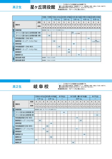 高2生星ヶ丘現役館この色のマスが授業のある時限です。●同一名称の講座は設置校舎・設置期間(ターム)・授業時間(時限)が異なっても同一内容です。●担当講師は変更になる場合がありますので、あらかじめご了承ください。映像授業は69・70ページをご覧ください。7/28(日)・7/29(月)7/30(火)~8/3(土)8/5(月)~8/9(金)8/12(月・振)~8/16(金)8/19(月)~8/23(金)8/26(月)~8/28(水)―561ターム562ターム563ターム564ターム565ターム5617:2019:1017:2019:1017:2019:1017:2019:1017:2019:1017:2019:10〜〜〜〜〜〜〜〜〜〜〜〜18:5020:4018:5020:4018:5020:4018:5020:4018:5020:4018:5020:40映像授業の一覧は、69・70ページをご参照ください。村瀬8/12・13の2日間水嶋村瀬小栗実施期間:7/30(火)〜8/26(月)実施期間:7/30(火)〜8/26(月)松岡渡部8/28は5限のみ桑野高田斉藤山上平野講座名時限時間映像授業【ダイジェスト】夏から始める入試対策英語(難関・標準)【ダイジェスト】夏から始める入試対策数学(難関・標準)特別選抜英語(ONEWEX)難関英語(トップ・ハイレベル)標準英語特別選抜数学(ONEWEX)難関数学(トップ・ハイレベル)標準数学難関現代文個別指導英語個別指導数学講座種類教科映像総合ダイジェストセットレベル別講座個別高2生岐阜校この色のマスが授業のある時限です。●同一名称の講座は設置校舎・設置期間(ターム)・授業時間(時限)が異なっても同一内容です。●担当講師は変更になる場合がありますので、あらかじめご了承ください。映像授業は69・70ページをご覧ください。7/30(火)~8/3(土)8/5(月)~8/9(金)8/10(土)8/12(月・振)~8/16(金)8/17(土)1ターム2ターム4564564―53ターム61234564―5615:30〜17:0017:20〜18:5019:10〜20:4015:30〜17:0017:20〜18:5019:10〜20:4015:30〜17:0017:20〜18:5019:10〜20:409:10〜10:4011:00〜12:3013:40〜15:1015:30〜17:0017:20〜18:5019:10〜20:4015:30〜17:0017:20〜18:5019:10〜20:40時限時間講座名講座種類教科映像授業【ダイジェスト】夏から始める入試対策英語(難関・標準)【ダイジェスト】夏から始める入試対策数学(難関・標準)特別選抜英語(ONEWEX)難関英語(トップ・ハイレベル)標準英語特別選抜数学(ONEWEX)難関数学(トップ・ハイレベル)標準数学難関現代文難関古文難関物理難関化学映像授業の一覧は、69・70ページをご参照ください。室田宮田室田宮田西畑高原村瀬伊藤西浦川野川野谷口佐藤若原映像総合ダイジェストットレベル別講座●2024年度/夏期講習/中部/星ヶ丘/高2生/パターン12452024_56_4_439_32_20240328154915.csv/1ページ校了時削除