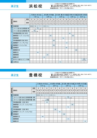 高2生浜松校この色のマスが授業のある時限です。●同一名称の講座は設置校舎・設置期間(ターム)・授業時間(時限)が異なっても同一内容です。●担当講師は変更になる場合がありますので、あらかじめご了承ください。映像授業は69・70ページをご覧ください。7/30(火)~8/3(土)8/5(月)~8/9(金)8/12(月・振)~8/16(金)8/19(月)~8/23(金)8/26(月)~8/28(水)1ターム2ターム3ターム4ターム5ターム34563456345645645613:40〜15:1015:30〜17:0017:30〜19:0019:30〜21:0013:40〜15:1015:30〜17:0017:30〜19:0019:30〜21:0013:40〜15:1015:30〜17:0017:30〜19:0019:30〜21:0015:30〜17:0017:30〜19:0019:30〜21:0015:30〜17:0017:30〜19:0019:30〜21:00時限時間講座名講座種類教科映像授業【ダイジェスト】夏から始める入試対策英語(難関・標準)【ダイジェスト】夏から始める入試対策数学(難関・標準)特別選抜英語(ONEWEX)難関英語(トップ・ハイレベル)標準英語特別選抜数学(ONEWEX)難関数学(トップレベル)難関数学(ハイレベル)標準数学難関現代文難関古文難関物理難関化学知らないと損するリスニング対策古典文法映像授業の一覧は、69・70ページをご参照ください。青木7/30・31の2日間谷口7/30・31の2日間青木河原笠岡室田原田亀山小田鷲山安達河合小林中村河合原田8/26のみ映像総合ダイジェストセットレベル別講座テーマ講座高2生豊橋校この色のマスが授業のある時限です。●同一名称の講座は設置校舎・設置期間(ターム)・授業時間(時限)が異なっても同一内容です。●担当講師は変更になる場合がありますので、あらかじめご了承ください。映像授業は69・70ページをご覧ください。7/30(火)~8/3(土)8/5(月)~8/9(金)8/12(月・振)~8/16(金)8/19(月)~8/23(金)1ターム2ターム3ターム4ターム45645645645615:3017:2019:1015:3017:2019:1015:3017:2019:1015:3017:2019:10〜〜〜〜〜〜〜〜〜〜〜〜17:0018:5020:4017:0018:5020:4017:0018:5020:4017:0018:5020:40映像授業の一覧は、69・70ページをご参照ください。三田村7/30・31の2日間川野安達原田8/12・13の2日間原田市位宮田河合三輪岸中村講座名時限時間映像授業【ダイジェスト】夏から始める入試対策英語(難関・標準)【ダイジェスト】夏から始める入試対策数学(難関・標準)特別選抜英語(ONEWEX)難関英語(トップ・ハイレベル)標準英語特別選抜数学(ONEWEX)難関数学(トップ・ハイレベル)標準数学難関現代文難関物理難関化学講座種類教科映像総合ダイジェストットレベル別講座●2024年度/夏期講習/中部/浜松/高2生/パターン13452024_56_4_433_32_20240325112116.csv/1ページ校了時削除