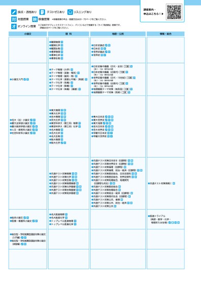 採点・添削ありテストゼミありリスニングあり対オ対面授業映映像授業*映像授業の申込・受講方法は69・70ページをご覧ください。オンライン授業※ご自宅でタブレットやスマートフォン、パソコンなどで受講する「ライブ配信型」授業です。詳細は68ページをご覧ください。講座案内・申込はこちら!▶小論文理科地歴・公民情報・総合●難関物理対●難関化学対●難関生物対●標準物理対●標準化学対●標準生物対●日本史論述●日本史対オ●世界史論述●世界史対オ対対●小論文入門対●テーマ物理(力学)対●テーマ物理(波動・電気)対●テーマ物理(磁気・熱)対●テーマ化学(速度と平衡)[発展]対●テーマ化学(有機)対●テーマ化学(無機)対●テーマ化学(有機)[基礎]対●名大(法)小論文●慶大法学部小論文●慶大経済学部小論文●人文・教育系小論文●社会科学系小論文対対対対対●東大物理対映●東大化学対映●京大物理対映●京大化学対映●東京科学大(理工系)物理対●東京科学大(理工系)化学対●名大物理対●名大化学対●名大生物対●阪大物理対●阪大化学対●共通テスト対策物理対映●共通テスト対策化学対映●共通テスト対策生物対映●共通テスト対策物理基礎映●共通テスト対策化学基礎対映●共通テスト対策生物基礎対映●共通テスト対策地学基礎映●医系小論文●医療・看護系小論文対対●名大医進物理対●名大医進化学対●トップレベル医進物理対●トップレベル医進化学対●総合型・学校推薦型選抜対策小論文(入門編)●総合型・学校推薦型選抜対策小論文(演習編)対対10講対10講対●日本史集中講義(古代-近世)(高2・3生・高卒生共通)●日本史集中講義(近現代)(高2・3生・高卒生共通)●世界史集中講義(古代-18世紀)(高2・3生・高卒生共通)●世界史集中講義(近現代)(高2・3生・高卒生共通)●地理重要テーマ対策(地形図)●地理重要テーマ対策(気候)10講対2講2講対10講対対対映対映対映●東大日本史●東大世界史●東大地理対映●京大日本史●京大世界史対映●早慶大日本史対オ●早慶大世界史対オ●共通テスト対策日本史B(旧課程)対映●共通テスト対策世界史B(旧課程)対映●共通テスト対策倫理(旧課程)映●共通テスト対策倫理,政治・経済(旧課程)対映●共通テスト対策歴史総合,日本史探究対映●共通テスト対策歴史総合,世界史探究対映●共通テスト対策地理総合,地理探究(旧課程も対応)対映●共通テスト対策歴史総合映●共通テスト対策地理総合映●共通テスト対策政治・経済(旧課程)映●共通テスト対策現代社会(旧課程)映●共通テスト対策公共,倫理映●共通テスト対策公共,政治・経済対映●共通テスト対策公共映●共通テスト対策情報Ⅰ映●医進トライアル(英語・数学・化学・物理または生物)対映