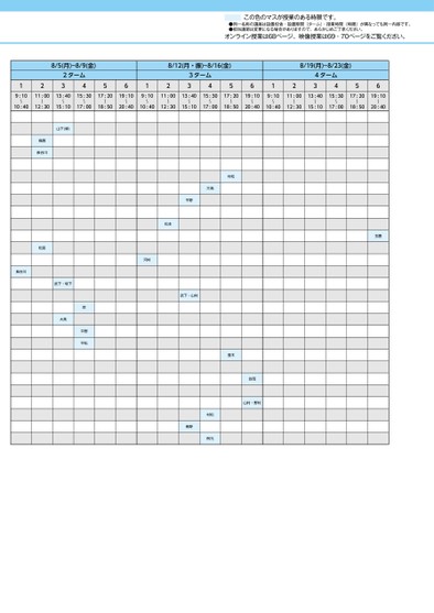 この色のマスが授業のある時限です。●同一名称の講座は設置校舎・設置期間(ターム)・授業時間(時限)が異なっても同一内容です。●担当講師は変更になる場合がありますので、あらかじめご了承ください。オンライン授業は68ページ、映像授業は69・70ページをご覧ください。8/5(月)~8/9(金)2ターム34128/12(月・振)~8/16(金)56123ターム3456128/19(月)~8/23(金)4ターム34569:10〜10:4011:0013:4015:3017:2019:10〜〜〜〜〜12:3015:1017:0018:5020:409:10〜10:4011:0013:4015:3017:2019:1012:3015:1017:0018:5020:40〜〜〜〜〜9:10〜10:4011:0013:4015:3017:2019:10〜〜〜〜〜12:3015:1017:0018:5020:40山下(博)福眞長谷川松延長谷川武下・坂下大髙岸平野平松村松大髙平野松本河村武下・山村登木笠岡山村・野村青野村松桝元玉置