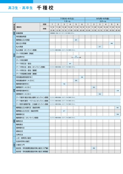 7/30(火)~8/3(土)1ターム341256128/5(月)~8/9(金)2ターム34569:10〜10:4011:0013:4015:3017:2019:10〜〜〜〜〜12:3015:1017:0018:5020:409:10〜10:4011:0013:4015:3017:2019:10〜〜〜〜〜12:3015:1017:0018:5020:40映像授業の一覧は、69・70ページをご参照ください。金井オンライン授業の詳細は、68ページをご参照ください。森7/30・7/31の2日間金井オンライン授業の詳細は、68ページをご参照ください。笠岡笠岡大庭オンライン授業の詳細は、68ページをご参照ください。オンライン授業の詳細は、68ページをご参照ください。オンライン授業の詳細は、68ページをご参照ください。坂下オンライン授業の詳細は、68ページをご参照ください。塚越宮下小栗福永安達宮田宮田高尾講座名時限時間映像授業特別選抜英語難関国公立大英語国公立大英語私大英語私大英語(オンライン授業)テーマ英文解釈[発展]自由英作文テーマ英文解釈テーマ英文法・語法テーマ英文法・語法(オンライン授業)テーマ英文法・語法[基礎]テーマ英語構文演習[基礎]特別選抜理系数学ⅢC特別選抜数学ⅠAⅡBC難関理系数学ⅢC難関数学ⅠAⅡBC標準理系数学ⅢC標準数学ⅠAⅡBCテーマ数学(場合の数と確率)オンライン授業)テーマ数学(数列・ベクトル)オンライン授業)テーマ数学(複素数平面・2次曲線)オンライン授業)難関国公立大現代文(論述対策)難関国公立大古文(論述対策)難関現代文難関現代文(オンライン授業)難関古文難関漢文標準現代文標準古文古典文法人文・教育系小論文社会科学系小論文小論文入門総合型・学校推薦型選抜対策小論文(入門編)総合型・学校推薦型選抜対策小論文(演習編)講座種類教科映像総合英語数学国語小論文●2024年度/夏期講習/中部/千種/高3・卒生/パターン25402024_56_4_413_11_20240328124240.csv/1ページ校了時削除高3生・高卒生千種校