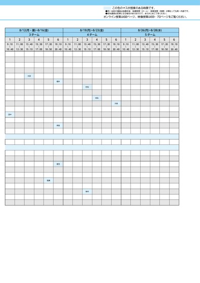 この色のマスが授業のある時限です。●同一名称の講座は設置校舎・設置期間(ターム)・授業時間(時限)が異なっても同一内容です。●担当講師は変更になる場合がありますので、あらかじめご了承ください。オンライン授業は68ページ、映像授業は69・70ページをご覧ください。8/12(月・振)~8/16(金)123ターム3456128/19(月)~8/23(金)4ターム3456128/26(月)~8/28(水)5ターム34569:10〜10:4011:0013:4015:3017:2019:1012:3015:1017:0018:5020:40〜〜〜〜〜9:10〜10:4011:0013:4015:3017:2019:10〜〜〜〜〜12:3015:1017:0018:5020:409:10〜10:4011:0013:4015:3017:2019:10〜〜〜〜〜12:3015:1017:0018:5020:40村松村松大髙大宮田中福井伊倉室田福眞笹村