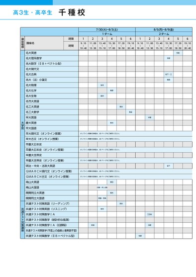 7/30(火)~8/3(土)1ターム341256128/5(月)~8/9(金)2ターム34569:10〜10:4011:0013:4015:3017:2019:10〜〜〜〜〜12:3015:1017:0018:5020:409:10〜10:4011:0013:4015:3017:2019:10〜〜〜〜〜12:3015:1017:0018:5020:40松延市野坂下・江高尾宮下坂本福井青野笹村落合高田守屋オンライン授業の詳細は、68ページをご参照ください。オンライン授業の詳細は、68ページをご参照ください。オンライン授業の詳細は、68ページをご参照ください。オンライン授業の詳細は、68ページをご参照ください。オンライン授業の詳細は、68ページをご参照ください。オンライン授業の詳細は、68ページをご参照ください。時限時間講座名講座種類教科名大英語名大理系数学名大数学(ⅡB+ベクトル型)名大現代文名大古典名大(法)小論文名大物理名大化学名大生物名市大英語名工大英語名工大数学早大英語慶大英語早大国語早大現代文(オンライン授業)早大古文(オンライン授業)早慶大日本史早慶大日本史(オンライン授業)早慶大世界史早慶大世界史(オンライン授業)明治・中央・法政大英語GMARCH現代文(オンライン授業)GMARCH古文(オンライン授業)南山大英語南山大国語関関同立大英語関関同立大国語大学別塚田落合日嵩・井上(摩)齊藤・笹森笹村宮本三田村市野市野笠岡共通テスト対策英語(リーディング)共通テスト対策英語(リスニング)共通テスト対策数学ⅠA共通テスト対策数学(統計的な推測)共通テスト対策数学ⅠA(旧課程)共通テスト対策数学(平面上の曲線と複素数平面)共通テスト対策数学(ⅡB+ベクトル型)共通テスト対策講座高3生・高卒生千種校●2024年度/夏期講習/中部/千種/高3・卒生/パターン25402024_56_4_413_11_20240328124240.csv/3ページ校了時削除