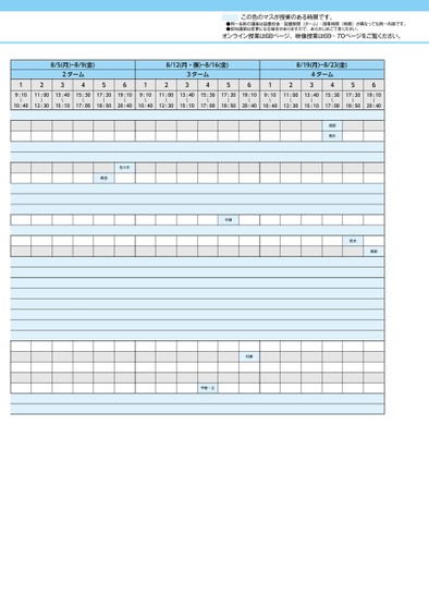 この色のマスが授業のある時限です。●同一名称の講座は設置校舎・設置期間(ターム)・授業時間(時限)が異なっても同一内容です。●担当講師は変更になる場合がありますので、あらかじめご了承ください。オンライン授業は68ページ、映像授業は69・70ページをご覧ください。8/5(月)~8/9(金)2ターム34128/12(月・振)~8/16(金)56123ターム3456128/19(月)~8/23(金)4ターム34569:10〜10:4011:0013:4015:3017:2019:10〜〜〜〜〜12:3015:1017:0018:5020:409:10〜10:4011:0013:4015:3017:2019:1012:3015:1017:0018:5020:40〜〜〜〜〜9:10〜10:4011:0013:4015:3017:2019:10〜〜〜〜〜12:3015:1017:0018:5020:40渡部青木佐々木高田平野荒木青野村瀬平野・江