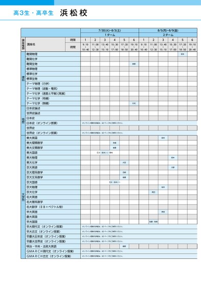 7/30(火)~8/3(土)1ターム341256128/5(月)~8/9(金)2ターム34569:10〜10:4011:0013:4015:3017:2019:10〜〜〜〜〜12:3015:1017:0018:5020:409:10〜10:4011:0013:4015:3017:2019:10〜〜〜〜〜12:3015:1017:0018:5020:40坂本榊原中村坂本川野笹村坂本原田髙田佐藤・笹森オンライン授業の詳細は、68ページをご参照ください。オンライン授業の詳細は、68ページをご参照ください。崎後藤石川・鈴木(一)・野村大宮崎後藤石川・鈴木(一)オンライン授業の詳細は、68ページをご参照ください。オンライン授業の詳細は、68ページをご参照ください。オンライン授業の詳細は、68ページをご参照ください。オンライン授業の詳細は、68ページをご参照ください。桑野オンライン授業の詳細は、68ページをご参照ください。オンライン授業の詳細は、68ページをご参照ください。時限時間講座名講座種類教科難関物理難関化学難関生物標準物理標準化学標準生物テーマ物理(力学)テーマ物理(波動・電気)テーマ化学(速度と平衡)[発展]テーマ化学(有機)テーマ化学(無機)日本史論述世界史論述日本史日本史(オンライン授業)世界史世界史(オンライン授業)東大英語東大理類数学東大文類数学東大国語東大物理東大化学京大英語京大理系数学京大文系数学京大国語京大物理京大化学名大英語名大理系数学名大数学(ⅡB+ベクトル型)早大英語慶大英語早大国語早大現代文(オンライン授業)早大古文(オンライン授業)早慶大日本史(オンライン授業)早慶大世界史(オンライン授業)明治・中央・法政大英語GMARCH現代文(オンライン授業)GMARCH古文(オンライン授業)理科地歴大学別●2024年度/夏期講習/中部/浜松/高3・卒生/パターン25452024_56_4_433_11_20240325112120.csv/2ページ校了時削除高3生・高卒生浜松校