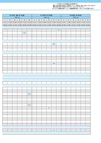 この色のマスが授業のある時限です。●同一名称の講座は設置校舎・設置期間(ターム)・授業時間(時限)が異なっても同一内容です。●担当講師は変更になる場合がありますので、あらかじめご了承ください。オンライン授業は68ページ、映像授業は69・70ページをご覧ください。8/12(月・振)~8/16(金)123ターム3456128/19(月)~8/23(金)4ターム3456128/26(月)~8/28(水)5ターム34569:10〜10:4011:0013:4015:3017:2019:1012:3015:1017:0018:5020:40〜〜〜〜〜9:10〜10:4011:0013:4015:3017:2019:10〜〜〜〜〜12:3015:1017:0018:5020:409:10〜10:4011:0013:4015:3017:2019:10〜〜〜〜〜12:3015:1017:0018:5020:40宮下川野川野三田村中村北村河合荒木