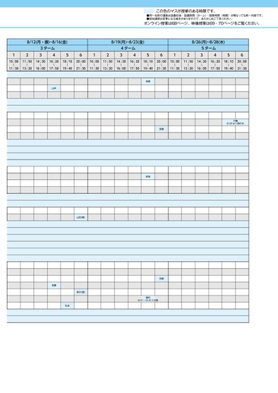 この色のマスが授業のある時限です。●同一名称の講座は設置校舎・設置期間(ターム)・授業時間(時限)が異なっても同一内容です。●担当講師は変更になる場合がありますので、あらかじめご了承ください。オンライン授業は68ページ、映像授業は69・70ページをご覧ください。8/12(月・振)~8/16(金)123ターム3456128/19(月)~8/23(金)4ターム3456128/26(月)~8/28(水)5ターム345610:0011:5014:3016:2018:1020:0010:0011:5014:3016:2018:1020:0010:0011:5014:3016:2018:1020:00〜〜〜〜〜〜〜〜〜〜〜11:3013:2016:0017:5019:4021:3011:3013:2016:0017:5019:4021:3011:3013:2016:0017:5019:4021:30〜〜〜〜〜〜〜加藤三輪8/28は5限のみ岩崎宮地山本山田(龍)加藤鈴木(理)松本吉嗣横井8/21〜23の3日間