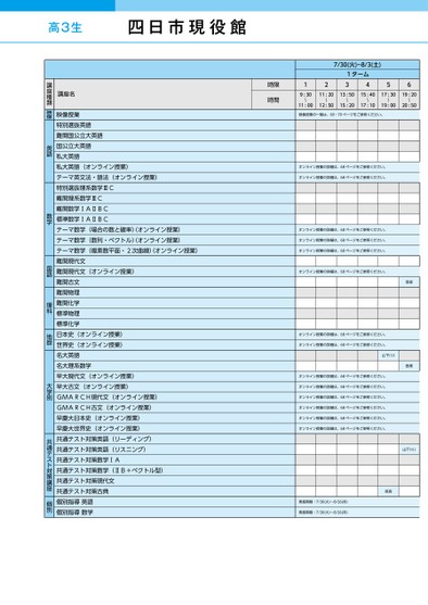7/30(火)~8/3(土)1ターム3412569:30〜11:0011:2013:5015:4017:3019:20〜〜12:5015:2017:1019:0020:50〜〜〜映像授業の一覧は、69・70ページをご参照ください。オンライン授業の詳細は、68ページをご参照ください。オンライン授業の詳細は、68ページをご参照ください。オンライン授業の詳細は、68ページをご参照ください。オンライン授業の詳細は、68ページをご参照ください。オンライン授業の詳細は、68ページをご参照ください。オンライン授業の詳細は、68ページをご参照ください。笹森オンライン授業の詳細は、68ページをご参照ください。オンライン授業の詳細は、68ページをご参照ください。山下(り)西畑オンライン授業の詳細は、68ページをご参照ください。オンライン授業の詳細は、68ページをご参照ください。オンライン授業の詳細は、68ページをご参照ください。オンライン授業の詳細は、68ページをご参照ください。オンライン授業の詳細は、68ページをご参照ください。オンライン授業の詳細は、68ページをご参照ください。山下(り)笹森実施期間:7/30(火)〜8/26(月)実施期間:7/30(火)〜8/26(月)時限時間高3生四日市現役館講座名映像授業特別選抜英語難関国公立大英語国公立大英語私大英語私大英語(オンライン授業)テーマ英文法・語法(オンライン授業)特別選抜理系数学ⅢC難関理系数学ⅢC難関数学ⅠAⅡBC標準数学ⅠAⅡBCテーマ数学(場合の数と確率)オンライン授業)テーマ数学(数列・ベクトル)オンライン授業)テーマ数学(複素数平面・2次曲線)オンライン授業)難関現代文難関現代文(オンライン授業)難関古文難関物理難関化学標準物理標準化学日本史(オンライン授業)世界史(オンライン授業)名大英語名大理系数学早大現代文(オンライン授業)早大古文(オンライン授業)GMARCH現代文(オンライン授業)GMARCH古文(オンライン授業)早慶大日本史(オンライン授業)早慶大世界史(オンライン授業)共通テスト対策英語(リーディング)共通テスト対策英語(リスニング)共通テスト対策数学ⅠA共通テスト対策数学(ⅡB+ベクトル型)共通テスト対策現代文共通テスト対策古典個別指導英語個別指導数学講座種類教科映像合英語数学国語理科地歴大学別共通テスト対策講座個別●2024年度/夏期講習/中部/四日市/高3・卒生/パターン24452024_56_4_435_11_20240325105400.csv/1ページ校了時削除