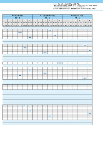 この色のマスが授業のある時限です。●同一名称の講座は設置校舎・設置期間(ターム)・授業時間(時限)が異なっても同一内容です。●担当講師は変更になる場合がありますので、あらかじめご了承ください。オンライン授業は68ページ、映像授業は69・70ページをご覧ください。8/5(月)~8/9(金)2ターム34128/12(月・振)~8/16(金)56123ターム3456128/19(月)~8/23(金)4ターム34569:30〜11:0011:2013:5015:4017:3019:20〜〜〜〜〜12:5015:2017:1019:0020:509:30〜11:0011:2013:5015:4017:3019:2012:5015:2017:1019:0020:50〜〜〜〜〜9:30〜11:0011:2013:5015:4017:3019:20〜〜〜〜〜12:5015:2017:1019:0020:50山下(り)嶋田西浦渡邉岸山下(り)嶋田伊藤伊藤高原花田井上(真)竹内河合若原井上(真)竹内