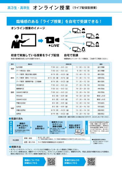 高3生・高卒生オンライン授業(ライブ配信型授業)臨場感のある「ライブ授業」を自宅で受講できる!オンライン授業のイメージ校舎で実施している授業をライブ配信自宅で受講教室の臨場感を感じながら受講できます。視聴端末とインターネット環境は、ご自身でご用意ください。講師成川博康成川博康森本啓夫佐野哲也森本啓夫木村哲也木村哲也木村哲也隼坂しのぶ隼坂しのぶ竹内良元竹内良元沼田英之沼田英之本授業は日程・講師が変更になる場合がありますので、あらかじめご了承ください。2024年度夏期講習同名講座(対面/映像)と同一内容です。本授業担当講師に、授業当日やWeb質問書で質問いただくことはできません。あらかじめご了承のうえ、お申し込みください。注意事項見逃し配信で復習もできる専用サイトにログインし講義を視聴見逃し配信は「終了した講単位」で視聴可能です。詳細は右下の二次元コードよりご確認ください。教材のお受け取り講座のお申し込みとお支払い他の夏期講習の講座と同様にお申し込みください。申込・受講方法申込期限新規・追加8/22(木)までライブ配信を受講する場合は、ライブ配信の受講開始日の4日前までにお申し込みください。変更・取りやめライブ配信の受講開始日の4日前まで◆推奨環境等の詳細は、右下の二次元コードよりご確認ください。●視聴方法タブレットやスマートフォン、パソコンなどの機器とインターネット環境をご準備ください。オンライン授業当日は、視聴サイトへアクセスし、ログインしてお待ちください。視聴先のURL・見逃し配信の視聴方法などの詳細は、教材に同封される「オンライン授業の受講方法について」をご確認ください。講座についての詳細はこちら受講方法などの詳細はこちら教科英語講座名私大英語テーマ英文法・語法テーマ数学(場合の数と確率)授業日時7/30(火)〜8/3(土)7/30(火)〜8/3(土)11:00〜12:3009:00〜10:308/19(月)〜8/23(金)13:40〜15:10数学テーマ数学(数列・ベクトル)8/12(月・振)〜8/16(金)11:40〜13:10テーマ数学(複素数平面・2次曲線)早大現代文難関現代文国語GMARCH現代文早大古文GMARCH古文早慶大日本史日本史早慶大世界史世界史地歴●受講の流れ8/19(月)〜8/23(金)11:20〜12:507/30(火)〜8/3(土)7/30(火)〜8/3(土)7/30(火)〜8/3(土)8/5(月)〜8/9(金)8/5(月)〜8/9(金)8/5(月)〜8/9(金)8/5(月)〜8/9(金)17:20〜18:5019:20〜20:5015:20〜16:5019:20〜20:5017:20〜18:5013:20〜14:5015:20〜16:508/19(月)〜8/23(金)13:20〜14:508/19(月)〜8/23(金)15:20〜16:50