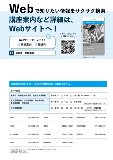 で知りたい情報をサクサク検索Web講座案内など詳細は、Webサイトへ!Webサイトでチェック!●講座案内●受講料河合塾夏期講習スマートフォンで簡単アクセス夏期講習(高校生・高卒生)ログインお気に入りカート高校生・高卒生第一志望大学合格をめざす高校生・高卒生のための短期集中講座今、知っておくべき要点を、わずか4日間で集中攻略。新学期以降の学習をスムーズに進められるように、この春、河合塾で始めよう!※画面はイメージです。受講相談については、下記の各校舎にお問い合わせください。[受付時間]名駅校・千種校・岐阜校・浜松校・豊橋校月~土11:00~19:00/日・祝10:00~17:00星ヶ丘現役館・刈谷現役館・岡崎現役館・豊田現役館・津現役館月~土14:00~20:00日曜休館※休館日以外の祝日も受付を行います。四日市現役館火~土14:00~20:00/日13:00~18:00月曜休館※休館日以外の祝日も受付を行います。名駅校千種校(052)451-0581浜松校(053)453-5581豊田現役館*(0565)32-5581(052)735-1588豊橋校(0532)54-0581四日市現役館*(059)350-4581星ヶ丘現役館*(052)782-0581刈谷現役館*(0566)21-3581津現役館*(059)226-0581岐阜校(058)264-5581岡崎現役館*(0564)54-3581※(学)河合塾主催。ただし、*の校舎は(株)河合塾進学研究社主催の校舎です。※「現役館」は登録商標です。※おかけ間違いにご注意ください。