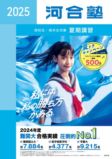 2025高校生・高卒生対象夏期講習高1・2生対象【ダイジェスト講座】1講座500円(税込)2024年度難関大合格実績圧倒的計7,884名計4,377名医学部医学科※3難関国立大※2※1早慶大計9,215名※12024年度合格実績をWebサイト・パンフレットで公表している予備校の中でNo.1(オルフェウスコンサルティング株式会社調べ)。※2難関国立大とは、東大・京大・北大・東北大・東工大・一橋大・名大・阪大・神大・広大・九大です。※3国公立大学医学部医学科計と私立大学医学部医学科計の合計です。*この合格実績は、河合塾グループ関連法人の在籍生および講習受講生の2024年度入試の合格者を集計した延べ人数であり、公開模試のみの受験生は含んでおりません。05016