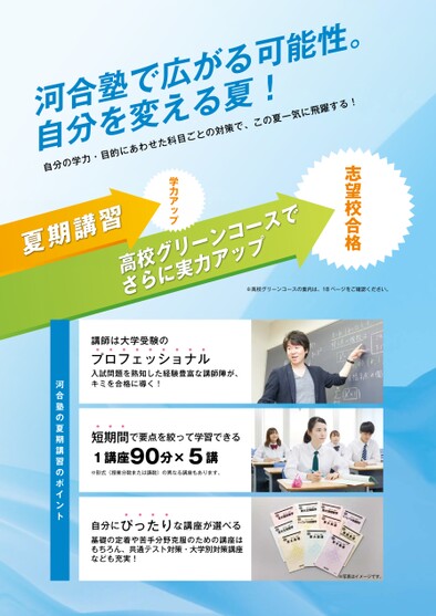 志望校合格※高校グリーンコースの案内は、18ページをご確認ください。河合塾で広がる可能性。自分を変える夏!的にとご!るあわ科たせで策こ、一夏に気す躍対の目の飛学力アップ夏期講習高校グリーンコースでさらに実力アップ目・力学分自の講師は大学受験のプロフェッショナル入試問題を熟知した経験豊富な講師陣が、キミを合格に導く!短期間で要点を絞って学習できる1講座90分×5講※形式(授業分数または講数)の異なる講座もあります。自分にぴったりな講座が選べる基礎の定着や苦手分野克服のための講座はもちろん、共通テスト対策・大学別対策講座なども充実!※写真はイメージです。河合塾の夏期講習のポイント
