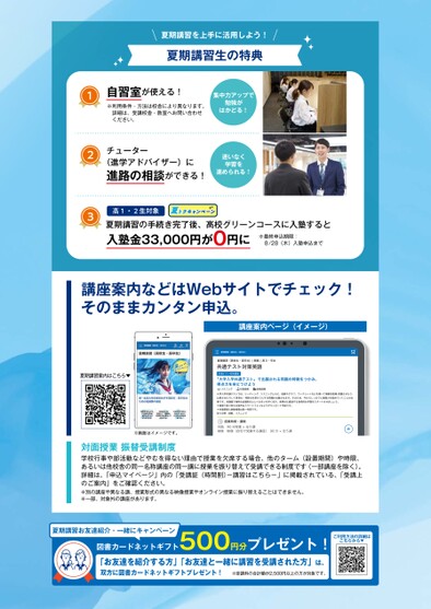 夏期講習を上手に活用しよう!夏期講習生の特典自習室が使える!※利用条件・方法は校舎により異なります。詳細は、受講校舎・教室へお問い合わせください。チューター(進学アドバイザー)に進路の相談ができる!高1・2生対象集中力アップで勉強がはかどる!迷いなく学習を進められる!夏期講習の手続き完了後、高校グリーンコースに入塾すると入塾金33,000円が0円に※最終申込期限:8/28(木)入塾申込まで123講座案内などはWebサイトでチェック!そのままカンタン申込。講座案内ページ(イメージ)夏期講習案内はこちら▼夏期講習(高校生・高卒生)夏期講習(高校生・高卒生)|関東|高3・卒生共通テスト対策英語共通テスト対策講座「大学入学共通テスト」で出題される問題の特徴をつかみ、得点力を身につけようリスニング対面授業映像授業大学入学共通テストでは、リーディング、リスニングともに、図表やグラフ、ワークシートなどを用いて情報を整理・把握させたり、比較させたりして思考力・判断力を測ろうとする問題が出題されます。そのため、今からしっかりと基礎力を固めていくことが必要です。本講座で独特な出題形式とレベルをいち早く知り、高得点に直結する効率的な学習をスタートさせましょう。*授業で扱う英文の音声はスマートフォンなどでダウンロード可能です。*対面授業と映像授業は同一内容です。扱う分野:読解、リスニング※画面はイメージです。授業時間・講数対面90分授業全5講映像映像(自宅で受講する講座)90分全5講対面授業振替受講制度学校行事や部活動などやむを得ない理由で授業を欠席する場合、他のターム(設置期間)や時限、あるいは他校舎の同一名称講座の同一講に授業を振り替えて受講できる制度です(一部講座を除く)。詳細は、「申込マイページ」内の「受講証(時間割)-講習はこちら-」に掲載されている、「受講上のご案内」をご確認ください。※別の講座や異なる講、授業形式の異なる映像授業やオンライン授業に振り替えることはできません。※一部、対象外の講座があります。夏期講習お友達紹介・一緒にキャンペーン図書カードネットギフト500円分プレゼント!ご利用方法の詳細はこちらから▶「お友達を紹介する方」「お友達と一緒に講習を受講された方」は、双方に図書カードネットギフトプレゼント!※受講料の合計額が2,500円以上の方が対象です。