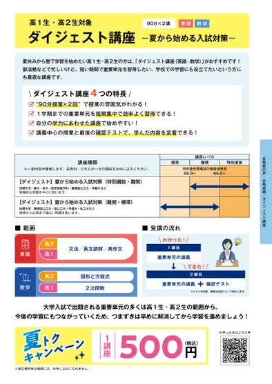 高1生・高2生対象ダイジェスト講座90分×2講英語数学夏から始める入試対策夏休みから塾で学習を始めたい高1生・高2生の方は、「ダイジェスト講座(英語・数学)」がおすすめです!部活動などで忙しいけど、短い期間で重要単元を習得したい、学校での学習にも役立てたいという方にも最適な講座です。ダイジェスト講座4つの特長で授業の雰囲気がわかる!□“90分授業×2回”□1学期までの重要単元を短期集中で効率よく習得できる!□自分の学力にあわせた講座で始めやすい!□講義中心の授業と最後の確認テストで、学んだ内容を定着できる!合格者の声・合格実績/ダイジェスト講座※一部内容が重複します。各教科、どちらか一方の講座をお申し込みください。講座種類ダイジェスト】夏から始める入試対策(特別選抜・難関)目標大学:東大・京大・医学部医学科・難関国公立大・早慶大など発展的な問題を中心に扱います。ダイジェスト】夏から始める入試対策(難関・標準)目標大学:難関国公立大・国公立大・早慶大・私立大など標準から応用まで幅広い問題を扱います。標準講座レベル難関特別選抜河合塾全統模試の偏差値目安65.0〜55.0〜■範囲英語数学高2高1高2高1文法/長文読解/英作文図形と方程式2次関数■受講の流れわかった!1講目重要単元の講義できた!2講目重要単元の講義確認テスト※テストの内容、時間は科目によって異なります。大学入試で出題される重要単元の多くは高1生・高2生の範囲から。今後の学習にもつながっていくため、つまずきは早めに解消してから学習を進めましょう!お申し込みはこちら▼500円(税込)1講座※塾生優先申込期間には、お申し込みになれません。