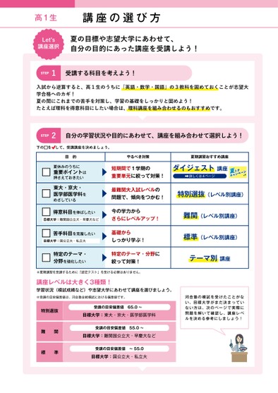 高1生講座の選び方Letʼs講座選択夏の目標や志望大学にあわせて、自分の目的にあった講座を受講しよう!STEP1受講する科目を考えよう!入試から逆算すると、高1生のうちに「英語・数学・国語」の3教科を固めておくことが志望大学合格へのカギ!夏の間にこれまでの苦手を対策し、学習の基礎をしっかりと固めよう!たとえば理科を得意科目にしたい場合は、理科講座を組み合わせるのもおすすめです。STEP2自分の学習状況や目的にあわせて、講座を組み合わせて選択しよう!下のをして、受講講座を決めましょう。目的夏休みのうちに重要ポイントは押さえておきたい東大・京大・医学部医学科をめざしているやるべき対策夏期講習おすすめ講座短期間で1学期の重要単元に絞って対策!ダイジェスト講座詳しくは4ページ最難関大入試レベルの問題で、傾向をつかむ!特別選抜(レベル別講座)得意科目を伸ばしたい目標大学:難関国公立大・早慶大など今の学力からさらにレベルアップ!苦手科目を克服したい目標大学:国公立大・私立大基礎からしっかり学ぶ!難関(レベル別講座)標準(レベル別講座)特定のテーマ・分野を強化したい特定のテーマ・分野に絞って対策!テーマ別講座※夏期講習を受講するために「認定テスト」を受ける必要はありません。講座レベルは大きく3種類!学習状況(模試成績など)や志望大学にあわせて講座を選びましょう。※受講の目安偏差値は、河合塾全統模試における偏差値です。特別選抜難関標準受講の目安偏差値65.0〜目標大学:東大・京大・医学部医学科受講の目安偏差値55.0〜目標大学:難関国公立大・早慶大など受講の目安偏差値〜55.0目標大学:国公立大・私立大河合塾の模試を受けたことがない、目標大学がまだ決まっていない方は、次のページで実際に問題を解いて確認し、講座レベルを決める参考にしましょう!
