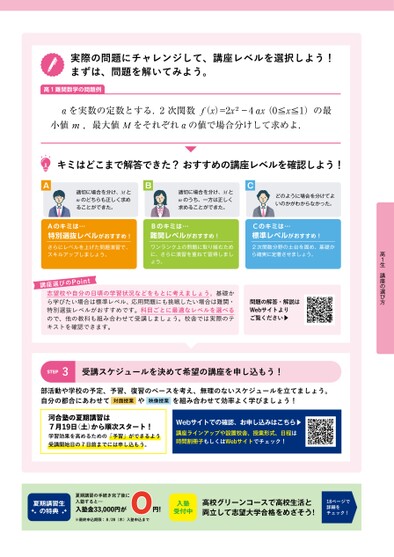 高1生講座の選び方キミはどこまで解答できた?おすすめの講座レベルを確認しよう!A適切に場合を分け、Mとmのどちらも正しく求めることができた。BC適切に場合を分け、Mとmのうち、一方は正しく求めることができた。どのように場合を分けてよいのかがわからなかった。Aのキミは…特別選抜レベルがおすすめ!さらにレベルを上げた問題演習で、スキルアップしましょう。Bのキミは…難関レベルがおすすめ!ワンランク上の問題に取り組むために、さらに演習を重ねて習得しましょう。Cのキミは…標準レベルがおすすめ!2次関数分野の土台を固め、基礎から確実に定着させましょう。講座選びのPoint志望校や自分の日頃の学習状況などをもとに考えましょう。基礎から学びたい場合は標準レベル、応用問題にも挑戦したい場合は難関・特別選抜レベルがおすすめです。科目ごとに最適なレベルを選べるので、他の教科も組み合わせて受講しましょう。校舎では実際のテキストを確認できます。問題の解答・解説はWebサイトよりご覧ください▶STEP3受講スケジュールを決めて希望の講座を申し込もう!実際の問題にチャレンジして、講座レベルを選択しよう!まずは、問題を解いてみよう。高1難関数学の問題例αを実数の定数とする.2次関数f()=22-4α(0≦≦1)の最小値,最大値Mをそれぞれαの値で場合分けして求めよ.部活動や学校の予定、予習、復習のペースを考え、無理のないスケジュールを立てましょう。自分の都合にあわせてやを組み合わせて効率よく学びましょう!対面授業映像授業河合塾の夏期講習は7月19日(土)から順次スタート!学習効果を高めるための「予習」ができるよう受講開始日の7日前までには申し込もう。Webサイトでの確認、お申し込みはこちら▶講座ラインアップや設置校舎、授業形式、日程は時間割冊子もしくはWebサイトでチェック!夏期講習生の特典夏期講習の手続き完了後に入塾すると…入塾金33,000円が※最終申込期限:8/28(木)入塾申込まで円!0入塾受付中高校グリーンコースで高校生活と両立して志望大学合格をめざそう!18ページで詳細をチェック!