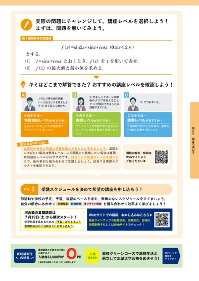 高2生講座の選び方キミはどこまで解答できた?おすすめの講座レベルを確認しよう!ABtのとり得る値の範囲(-√2≦t≦√2)を考えた上で⑵まで正しく解けた。C⑴が正しくでき、2次関数のグラフを考えることで⑵が解決できることは理解できていた。⑴でつまずいた。Aのキミは…特別選抜レベルがおすすめ!さらにレベルを上げた問題演習で、スキルアップしましょう。Bのキミは…難関レベルがおすすめ!ワンランク上の問題に取り組むために、さらに演習を重ねて習得しましょう。Cのキミは…標準レベルがおすすめ!三角関数分野の土台を固め、基礎から確実に定着させましょう。講座選びのPoint志望校や自分の日頃の学習状況などをもとに考えましょう。基礎から学びたい場合は標準レベル、応用問題にも挑戦したい場合は難関・特別選抜レベルがおすすめです。科目ごとに最適なレベルを選べるので、他の教科も組み合わせて受講しましょう。校舎では実際のテキストを確認できます。問題の解答・解説はWebサイトよりご覧ください▶実際の問題にチャレンジして、講座レベルを選択しよう!まずは、問題を解いてみよう。高2難関数学の問題例()=sin2+sin+cos(0≦<2π)fとする.⑴=sin+cosとおくとき,f()をを用いて表せ.⑵f()の最大値と最小値を求めよ.STEP3受講スケジュールを決めて希望の講座を申し込もう!部活動や学校の予定、予習、復習のペースを考え、無理のないスケジュールを立てましょう。自分の都合にあわせてを組み合わせて効率よく学びましょう!オンライン授業対面授業映像授業河合塾の夏期講習は7月19日(土)から順次スタート!学習効果を高めるための「予習」ができるよう受講開始日の7日前までには申し込もう。Webサイトでの確認、お申し込みはこちら▶講座ラインアップや設置校舎、授業形式、日程は時間割冊子もしくはWebサイトでチェック!夏期講習生の特典夏期講習の手続き完了後に入塾すると…入塾金33,000円が※最終申込期限:8/28(木)入塾申込まで円!0入塾受付中高校グリーンコースで高校生活と両立して志望大学合格をめざそう!18ページで詳細をチェック!