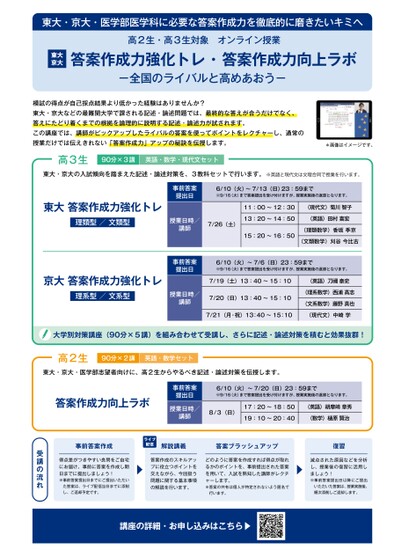 東大・京大・医学部医学科に必要な答案作成力を徹底的に磨きたいキミへ高2生・高3生対象オンライン授業東大京大答案作成力強化トレ・答案作成力向上ラボ-全国のライバルと高めあおう-模試の得点が自己採点結果より低かった経験はありませんか?東大・京大などの最難関大学で課される記述・論述問題では、最終的な答えが合うだけでなく、答えにたどり着くまでの根拠を論理的に説明する記述・論述力が試されます。この講座では、講師がピックアップしたライバルの答案を使ってポイントをレクチャーし、通常の授業だけでは伝えきれない「答案作成力」アップの秘訣を伝授します。高3生90分×3講英語・数学・現代文セット*画像はイメージです。東大・京大の入試傾向を踏まえた記述・論述対策を、3教科セットで行います。※英語と現代文は文理合同で授業を行います。東大答案作成力強化トレ理類型/文類型事前答案提出日6/10(火)〜7/13(日)23:59まで※9/16(火)まで答案提出を受け付けますが、授業実施後の返却となります。授業日時/講師7/26(土)11:00〜12:30(現代文)菊川智子13:20〜14:50(英語)田村喜宏15:20〜16:50(理類数学)香坂季京(文類数学)刈谷今比古京大答案作成力強化トレ理系型/文系型事前答案提出日授業日時/講師6/10(火)〜7/6(日)23:59まで※9/16(火)まで答案提出を受け付けますが、授業実施後の返却となります。7/19(土)13:40〜15:10(英語)刀泰史7/20(日)13:40〜15:10(理系数学)西浦高志(文系数学)藤野真也7/21(月・祝)13:40〜15:10(現代文)中崎学大学別対策講座(90分×5講)を組み合わせて受講し、さらに記述・論述対策を積むと効果抜群!高2生90分×2講英語・数学セット東大・京大・医学部志望者向けに、高2生からやるべき記述・論述対策を伝授します。答案作成力向上ラボ事前答案提出日授業日時/講師6/10(火)〜7/20(日)23:59まで※9/16(火)まで答案提出を受け付けますが、授業実施後の返却となります。8/3(日)17:20〜18:50(英語)胡摩﨑章秀19:10〜20:40(数学)樋原賢治事前答案作成ライブ配信解説講義答案ブラッシュアップ復習得点差がつきやすい良問をご自宅にお届け。事前に答案を作成し期日までに提出しましょう!※事前答案提出日までにご提出いただいた答案は、ライブ配信当日までに添削し、ご返却予定です。答案作成のスキルアップに役立つポイントを交えながら、今回扱う問題に関する基本事項の解説を行います。どのように答案を作成すれば得点が取れるかのポイントを、事前提出された答案を用いて、入試を熟知した講師がレクチャーします。※答案の共有は個人が特定されないよう匿名で行います。減点された原因などを分析し、授業後の復習に活用しましょう!※事前答案提出日以降にご提出いただいた答案は、授業実施後、順次添削しご返却します。受講の流れ講座の詳細・お申し込みはこちら▶