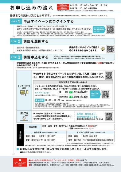 お申し込みの流れ先行申込一般申込6/2(月)18:00〜6/6(金)12:596/6(金)13:00〜申込開始※先行申込は、DMなどでご案内した方をはじめ、どなたでも一般申込に先駆けて先着順でお申し込みできます。受講までの流れは次のとおりです。※2025年度塾生は塾生優先申込があります。詳細はチュートリアルなどでご案内します。STEP1申込マイページにログインする講習のお申し込みには、生徒ご本人のログインⅠDが必要です。ログインⅠDをお持ちでない方はWebサイトの「お客様情報登録」から登録してください。※ログインⅠDをお持ちでない方は、事前にログインⅠDを登録いただくと、お手続きがスムーズに行えます。※過去に入塾・講習・模試のインターネット申込をされたことのある方は、お持ちのログインⅠDでお申し込みください。※ログインⅠDを登録される際には、Web画面に表示される「個人情報の保護に関する事項」をよく読み、同意のうえでお申し込みください。ログインまたはお客様情報登録はこちらSTEP2講座を選択する講座内容・授業日程を確認。志望大学や目的にあわせて時間割を組み立てましょう。講座内容はWebサイトで確認!そのままお申し込みできます。STEP3講習申込をする以下のいずれかの方法で、申込受付期間中に先着順でお申し込みできます。なお、定員に達した講座は受付を締め切りますのでお早めにお申し込みください。学習効果を高めるための「予習」ができるよう、申込期限にかかわらず受講開始日の7日前までのお申し込みをおすすめします。「個別指導講座」のお申し込みは、受講希望校舎窓口でのみ承ります。Webサイト「申込マイページ」にログイン後、「入塾(講座・コース)・講習・寮を申し込む」からご希望の講座をお申し込みください。操作方法などのお問い合わせインターネット申込インターネット申込の操作方法は、「申込ご利用ガイド」をご確認ください。なお、ご不明な点は、カスタマーセンターにお電話にてお問い合わせください。カスタマーセンター※おかけ間違いにご注意ください。【関東】【関東以外】受付時間12:00〜19:30日曜・祝日は受付を行いません。・・0120-504-1920120-123-439・・申込ご利用ガイド※ⅠP電話など、一部ご利用になれない場合があります。※受付開始直後および終了間際の時間帯は、お問い合わせが集中し、つながりにくいことがあります。ご了承ください。※カスタマーセンターでは、正確な応対と、対応品質向上のため、通話内容を録音させていただいております。窓口申込チューター(進学アドバイザー)が一人ひとりの学習状況に応じたご相談を承り、その場でお申し込みいただけます。各校舎・教室により、受付時間が異なります。受付時間の確認はWebサイトから▶変更・取りやめ:7/6(日)まで変更・取りやめ:ライブ配信の受講開始日の4日前まで*申込講座をすべて取りやめる場合(キャンセルまたは辞退)は、初回受講(視聴期間)開始日の4日前までに受講校舎へお申し出ください。※ライブ配信を受講する場合は、ライブ配信の受講開始日の4日前までにお申し込みください。映像授業※詳細は「時間割冊子」参照オンライン授業※詳細は「時間割冊子」参照新規・追加:8/21(木)まで新規・追加:8/21(木)まで申込期限■お申し込み受付完了後「申込受付完了のお知らせ」をメールにてご案内します。●お申し込み内容をご確認ください。対面授業新規・追加・変更・取りやめ:各講座の受講開始日の4日前まで※「短期集中習得TIME」は8/5(火)まで関東お申し込み上の注意●お申し込みには保護者等の方の「メールアドレス」の登録と、同意が必要です。●夏期講習を受講するために「認定テスト」を受ける必要はありません。ご希望の講座をお申し込みください。●同一名称講座の重複申込、設置期間(ターム)・日程・授業時間(時限)が重なる講座のお申し込みはできません。