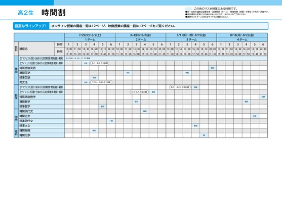 高2生時間割この色のマスが授業のある時限です。●同一名称の講座は設置校舎・設置期間(ターム)・授業時間(時限)が異なっても同一内容です。●担当講師は変更になる場合がありますので、あらかじめご了承ください。●講師のフルネームはWebサイトでご確認ください。豊富なラインアップ!オンライン授業の講座一覧は12ページ、映像授業の講座一覧は13ページをご覧ください。7/29(火)~8/2(土)1ターム431256128/4(月)~8/8(金)2ターム438/11(月・祝)~8/15(金)8/18(月)~8/22(金)56123ターム4356124ターム435610:0011:5014:3016:2018:1020:0010:0011:5014:3016:2018:1020:0010:0011:5014:3016:2018:1020:0010:0011:5014:3016:2018:1020:00〜〜〜〜〜〜〜〜〜〜〜〜〜11:3013:2016:0017:5019:4021:3011:3013:2016:0017:5019:4021:3011:3013:2016:0017:5019:4021:3011:3013:2016:0017:5019:4021:30〜〜〜〜〜〜〜〜〜〜〜8/10(日)14:30〜17:50西田本井8/1・8/2の2日間太田太田7/29~7/31の3日間田中一路島村本井宇田西田8/11・8/12の2日間石部8/4・8/5の2日間長岡田中篠原福田堀石部長岡川本時限時間講座名教科【ダイジェスト】夏から始める入試対策英語(特別選抜・難関)【ダイジェスト】夏から始める入試対策英語(難関・標準)特別選抜英語難関英語標準英語英文法【ダイジェスト】夏から始める入試対策数学(特別選抜・難関)【ダイジェスト】夏から始める入試対策数学(難関・標準)特別選抜数学難関数学標準数学難関現代文難関古文標準現代文標準古文難関物理難関化学英語数学国語理科