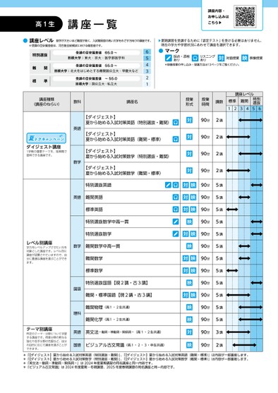 ▶夏期講習を受講するために「認定テスト」を受ける必要はありません。現在の学力や学習状況にあわせて講座を選択できます。●マーク採点・添削ありリスニングあり対対面授業映映像授業*映像授業の申し込み・受講方法は13ページをご覧ください。563412特別選抜難関標準受講の目安偏差値65.0〜目標大学:東大・京大・医学部医学科受講の目安偏差値55.0〜目標大学:北大をはじめとする難関国公立大・早慶大など受講の目安偏差値〜55.0目標大学:国公立大・私立大●講座レベル※受講の目安偏差値は、河合塾全統模試における偏差値です。数字が大きいほど難度が高く、入試難易度の高い大学をめざす方向けの講座です。講座レベル標準12難関34特別選抜56講座種類(講座のねらい)夏トクキャンペーンダイジェスト講座1学期の重要テーマを、短期間で習得できる講座です。教科英語数学講座名【ダイジェスト】夏から始める入試対策英語(特別選抜・難関)【ダイジェスト】夏から始める入試対策英語(難関・標準)【ダイジェスト】夏から始める入試対策数学(特別選抜・難関)【ダイジェスト】夏から始める入試対策数学(難関・標準)授業形式授業時間講数対対対対90分2講90分2講90分2講90分2講特別選抜英語対映90分5講レベル別講座学力をレベルアップさせたい方を対象とした講座です。レベル別に講座が設置されていますので、自分に最適な講座を選ぶことができます。英語難関英語標準英語特別選抜数学中高一貫特別選抜数学数学難関数学中高一貫難関数学標準数学国語理科特別選抜国語【現2講・古3講】難関・標準国語【現2講・古3講】難関物理(高1・2生共通)難関化学(高1・2生共通)テーマ別講座特定のテーマ・分野について学習する講座です。得意分野の更なる強化や苦手分野の克服など、自分の目的に応じて講座を選ぶことができます。英語英文法-動詞・準動詞・関係詞-(高1・2生共通)国語ビジュアル古文常識(高1・2・3・卒生共通)対映90分5講対映90分5講映90分5講対映90分5講映90分5講対映90分5講対映90分5講映90分5講対映90分5講映映対映90分5講90分5講90分3講90分2講*「【ダイジェスト】夏から始める入試対策英語(特別選抜・難関)」、「【ダイジェスト】夏から始める入試対策英語(難関・標準)」は内容が一部重複します。*「【ダイジェスト】夏から始める入試対策数学(特別選抜・難関)」、「【ダイジェスト】夏から始める入試対策数学(難関・標準)」は内容が一部重複します。*「英文法-動詞・準動詞・関係詞-」は2024年度夏期講習の同名講座と同一内容です。*「ビジュアル古文常識」は2024年度夏期・冬期講習、2025年度春期講習の同名講座と同一内容です。高1生講座一覧講座内容・お申し込みはこちら▶