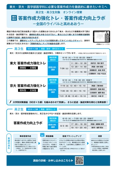 東大・京大・医学部医学科に必要な答案作成力を徹底的に磨きたいキミへ高2生・高3生対象オンライン授業東大京大答案作成力強化トレ・答案作成力向上ラボ-全国のライバルと高めあおう-模試の得点が自己採点結果より低かった経験はありませんか?東大・京大などの最難関大学で課される記述・論述問題では、最終的な答えが合うだけでなく、答えにたどり着くまでの根拠を論理的に説明する記述・論述力が試されます。この講座では、講師がピックアップしたライバルの答案を使ってポイントをレクチャーし、通常の授業だけでは伝えきれない「答案作成力」アップの秘訣を伝授します。高3生90分×3講英語・数学・現代文セット*画像はイメージです。東大・京大の入試傾向を踏まえた記述・論述対策を、3教科セットで行います。※英語と現代文は文理合同で授業を行います。東大答案作成力強化トレ理類型/文類型事前答案提出日6/10(火)〜7/13(日)23:59まで※9/16(火)まで答案提出を受け付けますが、授業実施後の返却となります。授業日時/講師7/26(土)11:00〜12:30(現代文)菊川智子13:20〜14:50(英語)田村喜宏15:20〜16:50(理類数学)香坂季京(文類数学)刈谷今比古京大答案作成力強化トレ理系型/文系型事前答案提出日授業日時/講師6/10(火)〜7/6(日)23:59まで※9/16(火)まで答案提出を受け付けますが、授業実施後の返却となります。7/19(土)13:40〜15:10(英語)刀泰史7/20(日)13:40〜15:10(理系数学)西浦高志(文系数学)藤野真也7/21(月・祝)13:40〜15:10(現代文)中崎学大学別対策講座(90分×5講)を組み合わせて受講し、さらに記述・論述対策を積むと効果抜群!高2生90分×2講英語・数学セット東大・京大・医学部志望者向けに、高2生からやるべき記述・論述対策を伝授します。答案作成力向上ラボ事前答案提出日授業日時/講師6/10(火)〜7/20(日)23:59まで※9/16(火)まで答案提出を受け付けますが、授業実施後の返却となります。8/3(日)17:20〜18:50(英語)胡摩﨑章秀19:10〜20:40(数学)樋原賢治事前答案作成ライブ配信解説講義答案ブラッシュアップ復習得点差がつきやすい良問をご自宅にお届け。事前に答案を作成し期日までに提出しましょう!※事前答案提出日までにご提出いただいた答案は、ライブ配信当日までに添削し、ご返却予定です。答案作成のスキルアップに役立つポイントを交えながら、今回扱う問題に関する基本事項の解説を行います。どのように答案を作成すれば得点が取れるかのポイントを、事前提出された答案を用いて、入試を熟知した講師がレクチャーします。※答案の共有は個人が特定されないよう匿名で行います。減点された原因などを分析し、授業後の復習に活用しましょう!※事前答案提出日以降にご提出いただいた答案は、授業実施後、順次添削しご返却します。受講の流れ講座の詳細・お申し込みはこちら▶