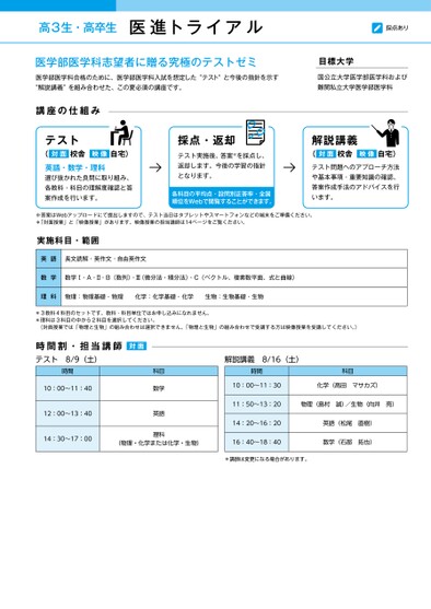 高3生・高卒生医進トライアル採点あり医学部医学科志望者に贈る究極のテストゼミ目標大学医学部医学科合格のために、医学部医学科入試を想定した“テスト”と今後の指針を示す“解説講義”を組み合わせた、この夏必須の講座です。国公立大学医学部医学科および難関私立大学医学部医学科講座の仕組みテスト対面(校舎自宅)映像英語・数学・理科選び抜かれた良問に取り組み、各教科・科目の理解度確認と答案作成を行います。採点・返却テスト実施後、答案※を採点し、返却します。今後の学習の指針となります。各科目の平均点・設問別正答率・全国順位をWebで閲覧することができます。解説講義映像対面(校舎自宅)テスト問題へのアプローチ方法や基本事項・重要知識の確認、答案作成手法のアドバイスを行います。※答案はWebアップロードにて提出しますので、テスト当日はタブレットやスマートフォンなどの端末をご準備ください。*「対面授業」と「映像授業」があります。映像授業の担当講師は14ページをご覧ください。実施科目・範囲英語長文読解・英作文・自由英作文数学数学Ⅰ・A・Ⅱ・B(数列)・Ⅲ(微分法・積分法)・C(ベクトル、複素数平面、式と曲線)理科物理:物理基礎・物理化学:化学基礎・化学生物:生物基礎・生物*3教科4科目のセットです。教科・科目単位ではお申し込みになれません。*理科は3科目の中から2科目を選択してください。(対面授業では「物理と生物」の組み合わせは選択できません。「物理と生物」の組み合わせで受講する方は映像授業を受講してください。)時間割・担当講師テスト8/9(土)対面時間10:00~11:4012:00~13:4014:30~17:00科目数学英語解説講義8/16(土)時間科目10:00~11:30化学(高田マサカズ)11:50~13:20物理(島村誠)/生物(向井亮)理科(物理・化学または化学・生物)14:20~16:20英語(松尾直樹)16:40~18:40数学(石部拓也)*講師は変更になる場合があります。