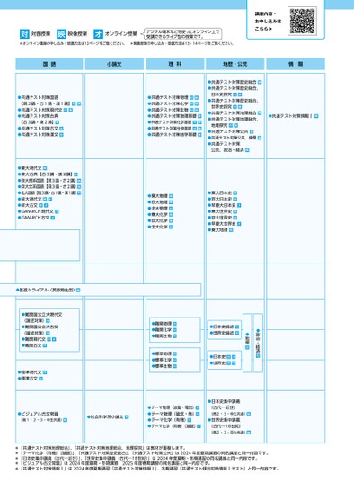 対対面授業映映像授業オオンライン授業デジタル端末などを使ったオンライン上で受講できるライブ型の授業です。*オンライン講座の申し込み・受講方法は12ページをご覧ください。*映像授業の申し込み・受講方法は13・14ページをご覧ください。講座内容・お申し込みはこちら▶国語小論文理科地歴・公民情報●共通テスト対策国語【現3講・古1講・漢1講】対映●共通テスト対策現代文対映●共通テスト対策古典【古3講・漢2講】映●共通テスト対策古文対●共通テスト対策漢文対●東大現代文映●東大古典【古3講・漢2講】映●京大理系国語【現3講・古2講】映●京大文系国語【現3講・古2講】映●北大国語【現3講・古1講・漢1講】対●早大現代文映オ●早大古文映オ●GMARCH現代文オ●GMARCH古文オ●共通テスト対策物理対映●共通テスト対策化学対映●共通テスト対策生物対映●共通テスト対策物理基礎映●共通テスト対策化学基礎対映●共通テスト対策生物基礎対映●共通テスト対策地学基礎映●共通テスト対策歴史総合映●共通テスト対策歴史総合,日本史探究対映●共通テスト対策歴史総合,世界史探究対映●共通テスト対策地理総合映●共通テスト対策地理総合,地理探究対映●共通テスト対策公共映●共通テスト対策公共,倫理映●共通テスト対策公共,政治・経済映●共通テスト対策情報Ⅰ映●東大物理映●京大物理映●北大物理対●東大化学映●京大化学映●北大化学対●東大日本史映●京大日本史映●早慶大日本史オ●東大世界史映●京大世界史映●早慶大世界史オ●東大地理映●ビジュアル古文常識(高1・2・3・卒生共通)映●社会科学系小論文対●テーマ物理(波動・電気)オ●テーマ物理(磁気・熱)対●テーマ化学(有機)対●テーマ化学(有機)[基礎]オ●日本史集中講義(古代―近世)(高2・3・卒生共通)映●世界史集中講義(古代―18世紀)(高2・3・卒生共通)映*「共通テスト対策地理総合」、「共通テスト対策地理総合,地理探究」は教材が重複します。*「テーマ化学(有機)[基礎]」、「共通テスト対策歴史総合」、「共通テスト対策公共」は2024年度夏期講習の同名講座と同一内容です。*「日本史集中講義(古代―近世)」、「世界史集中講義(古代―18世紀)」は2024年度夏期・冬期講習の同名講座と同一内容です。*「ビジュアル古文常識」は2024年度夏期・冬期講習、2025年度春期講習の同名講座と同一内容です。*「共通テスト対策情報Ⅰ」は2024年度夏期講習「共通テスト対策情報Ⅰ」、冬期講習「共通テスト傾向対策情報Ⅰテスト」と同一内容です。●政治・経済対●地理対●医進トライアル〈英数物生型〉映●難関国公立大現代文(論述対策)対●難関国公立大古文(論述対策)対●難関現代文対オ●難関古文対●標準現代文対●標準古文対●難関物理対●難関化学対●難関生物対●標準物理対●標準化学対●標準生物対●日本史論述対●世界史論述対●日本史対オ●世界史対オ
