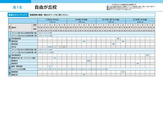 高1生自由が丘校豊富なラインアップ!映像授業の講座一覧は54ページをご覧ください。この色のマスが授業のある時限です。●同一名称の講座は設置校舎・設置期間(ターム)・授業時間(時限)が異なっても同一内容です。●担当講師は変更になる場合がありますので、あらかじめご了承ください。●講師のフルネームはWebサイトでご確認ください。7/29(火)~8/2(土)1ターム431256128/4(月)~8/8(金)2ターム438/11(月・祝)~8/15(金)8/18(月)~8/22(金)56123ターム4356124ターム435609:0010:5013:2015:1017:0018:5009:0010:5013:2015:1017:0018:5009:0010:5013:2015:1017:0018:5009:0010:5013:2015:1017:0018:50〜〜〜〜〜〜〜〜〜〜〜〜〜10:3012:2014:5016:4018:3020:2010:3012:2014:5016:4018:3020:2010:3012:2014:5016:4018:3020:2010:3012:2014:5016:4018:3020:20〜〜〜〜〜〜〜〜〜〜〜8/9(土)17:00〜20:20明慶7/26(土)17:00〜20:20藤田木村(智)7/29〜7/31の3日間7/20(日)13:20〜16:40國分8/16(土)13:20〜16:40高田(宇)合田藤田高田(宇)瀬﨑明慶水野國分福島中8/9(土)13:20〜16:40隼坂8/11(月)・12(火)10:50〜12:20隼坂祝・812(火)10:5〜1220隼坂8/14(木)・8/15(金)10:50〜12:20隼坂8/25(月)17:00〜20:20隼坂8/4(木1(金)10:5〜隼坂8/25(月)10〜隼坂西尾竹中時限時間講座名教科【ダイジェスト】夏から始める入試対策英語(特別選抜・難関)【ダイジェスト】夏から始める入試対策英語(難関・標準)特別選抜英語難関英語標準英語英文法【ダイジェスト】夏から始める入試対策数学(特別選抜・難関)【ダイジェスト】夏から始める入試対策数学(難関・標準)特別選抜数学難関数学中高一貫-アドバンスト(速習)-難関数学標準数学難関・標準国語ビジュアル古文常識難関物理難関化学英語数学国語理科