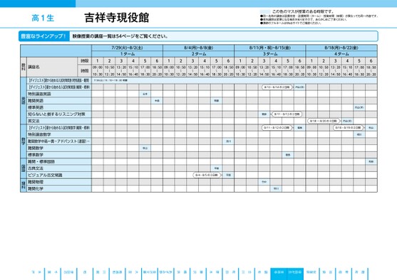 ●2025年度/夏期講習/東日本/自由が丘/高1生/パターン34602025_56_3_337_31_20250328213516.csv/1ページ校了時削除この色のマスが授業のある時限です。●同一名称の講座は設置校舎・設置期間(ターム)・授業時間(時限)が異なっても同一内容です。●担当講師は変更になる場合がありますので、あらかじめご了承ください。●講師のフルネームはWebサイトでご確認ください。高1生吉祥寺現役館7/29(火)~8/2(土)1ターム431256128/4(月)~8/8(金)2ターム438/11(月・祝)~8/15(金)8/18(月)~8/22(金)56123ターム4356124ターム435609:0010:5013:2015:1017:0018:5009:0010:5013:2015:1017:0018:5009:0010:5013:2015:1017:0018:5009:0010:5013:2015:1017:0018:50〜〜〜〜〜〜〜〜〜〜〜〜〜10:3012:2014:5016:4018:3020:2010:3012:2014:5016:4018:3020:2010:3012:2014:5016:4018:3020:2010:3012:2014:5016:4018:3020:20〜〜〜〜〜〜〜〜〜〜〜7/26(土)15:10〜18:30明慶山本中島明慶8/13・8/14の2日間内山(洋)青柳8/11・8/12の2日間8/11・8/12の2日間福島8/18・8/19の2日間秋山8/18〜8/20の3日間内山(洋)内山(洋)秋山流川平賀8/4・8/5の2日間平賀福島竹中早川相川和田時限時間講座名教科【ダイジェスト】夏から始める入試対策英語(特別選抜・難関)【ダイジェスト】夏から始める入試対策英語(難関・標準)特別選抜英語難関英語標準英語知らないと損するリスニング対策英文法【ダイジェスト】夏から始める入試対策数学(難関・標準)特別選抜数学難関数学中高一貫-アドバンスト(速習)-難関数学標準数学難関・標準国語古典文法ビジュアル古文常識難関物理難関化学英語数学国語理科豊富なラインアップ!映像授業の講座一覧は54ページをご覧ください。水戸千葉津田沼柏川越南浦和大宮金沢文庫あざみ野横浜藤沢厚木町田立川調布吉祥寺自由が丘秋葉原池袋新宿麹町