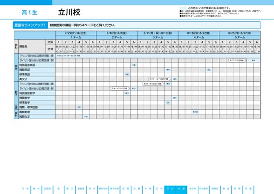 ●2025年度/夏期講習/東日本/調布/高1生/パターン34602025_56_3_367_31_20250328105147.csv/1ページ校了時削除この色のマスが授業のある時限です。●同一名称の講座は設置校舎・設置期間(ターム)・授業時間(時限)が異なっても同一内容です。●担当講師は変更になる場合がありますので、あらかじめご了承ください。●講師のフルネームはWebサイトでご確認ください。高1生立川校7/29(火)~8/2(土)8/4(月)~8/8(金)8/11(月・祝)~8/15(金)8/18(月)~8/22(金)8/25(月)~8/27(水)1ターム431256122ターム4356123ターム4356124ターム4356125ターム435609:0010:5013:2015:1017:0018:5009:0010:5013:2015:1017:0018:5009:0010:5013:2015:1017:0018:5009:0010:5013:2015:1017:0018:5009:0010:5013:2015:1017:0018:50〜〜〜〜〜〜〜〜〜〜〜〜〜〜〜〜〜〜〜〜〜〜〜〜10:3012:2014:5016:4018:3020:2010:3012:2014:5016:4018:3020:2010:3012:2014:5016:4018:3020:2010:3012:2014:5016:4018:3020:2010:3012:2014:5016:4018:3020:20〜〜〜〜〜〜7/26(土)17:00〜20:20中園8/27の1日完結高山中園中園8/4・8/5の2日間杉山相川東内高山8/11〜8/13の3日間東内8/11・8/12の2日間横川横川古谷長谷川和田小竹時限時間講座名教科【ダイジェスト】夏から始める入試対策英語(特別選抜・難関)【ダイジェスト】夏から始める入試対策英語(難関・標準)特別選抜英語難関英語標準英語英文法【ダイジェスト】夏から始める入試対策数学(特別選抜・難関)【ダイジェスト】夏から始める入試対策数学(難関・標準)特別選抜数学難関数学標準数学難関・標準国語難関物理難関化学英語数学国語理科豊富なラインアップ!映像授業の講座一覧は54ページをご覧ください。水戸千葉津田沼柏川越南浦和大宮金沢文庫あざみ野横浜藤沢厚木町田立川調布吉祥寺自由が丘秋葉原池袋新宿麹町
