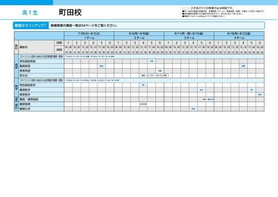 高1生町田校豊富なラインアップ!映像授業の講座一覧は54ページをご覧ください。この色のマスが授業のある時限です。●同一名称の講座は設置校舎・設置期間(ターム)・授業時間(時限)が異なっても同一内容です。●担当講師は変更になる場合がありますので、あらかじめご了承ください。●講師のフルネームはWebサイトでご確認ください。7/29(火)~8/2(土)1ターム431256128/4(月)~8/8(金)2ターム438/11(月・祝)~8/15(金)8/18(月)~8/22(金)56123ターム4356124ターム435609:0010:5013:2015:1017:0018:5009:0010:5013:2015:1017:0018:5009:0010:5013:2015:1017:0018:5009:0010:5013:2015:1017:0018:50〜〜〜〜〜〜〜〜〜〜〜〜〜10:3012:2014:5016:4018:3020:2010:3012:2014:5016:4018:3020:2010:3012:2014:5016:4018:3020:2010:3012:2014:5016:4018:3020:20〜〜〜〜〜〜〜〜〜〜〜7/26(土)15:20〜18:50近藤8/16(土)15:20〜18:50東内東内7/20(日)15:20〜18:50秋山8/4(月)・8/5(火)17:00〜18:30堺中島加藤栗原8/4〜8/6の3日間堺佐々木(哲)秋山中林・清水(め)安達近藤隣板谷講座名時限時間【ダイジェスト】夏から始める入試対策英語(難関・標準)特別選抜英語難関英語標準英語英文法【ダイジェスト】夏から始める入試対策数学(難関・標準)特別選抜数学難関数学標準数学難関・標準国語難関物理難関化学教科英語数学国語理科
