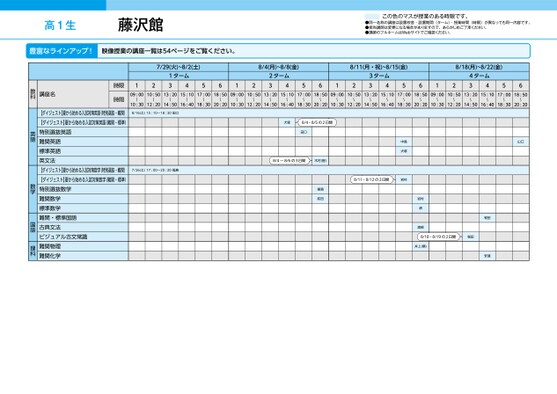 高1生藤沢館豊富なラインアップ!映像授業の講座一覧は54ページをご覧ください。この色のマスが授業のある時限です。●同一名称の講座は設置校舎・設置期間(ターム)・授業時間(時限)が異なっても同一内容です。●担当講師は変更になる場合がありますので、あらかじめご了承ください。●講師のフルネームはWebサイトでご確認ください。7/29(火)~8/2(土)1ターム431256128/4(月)~8/8(金)2ターム438/11(月・祝)~8/15(金)8/18(月)~8/22(金)56123ターム4356124ターム435609:0010:5013:2015:1017:0018:5009:0010:5013:2015:1017:0018:5009:0010:5013:2015:1017:0018:5009:0010:5013:2015:1017:0018:50〜〜〜〜〜〜〜〜〜〜〜〜〜10:3012:2014:5016:4018:3020:2010:3012:2014:5016:4018:3020:2010:3012:2014:5016:4018:3020:2010:3012:2014:5016:4018:3020:20〜〜〜〜〜〜〜〜〜〜〜8/16(土)15:10〜18:30田口7/26(土)17:00〜20:20福島犬塚8/4・8/5の2日間田口8/4〜8/6の3日間木村(智)中島犬塚山口8/11・8/12の2日間岩村福島前田岩村堺渡部8/18・8/19の2日間税田井上(順)税田安達時限時間講座名教科【ダイジェスト】夏から始める入試対策英語(特別選抜・難関)【ダイジェスト】夏から始める入試対策英語(難関・標準)特別選抜英語難関英語標準英語英文法【ダイジェスト】夏から始める入試対策数学(特別選抜・難関)【ダイジェスト】夏から始める入試対策数学(難関・標準)特別選抜数学難関数学標準数学難関・標準国語古典文法ビジュアル古文常識難関物理難関化学英語数学国語理科