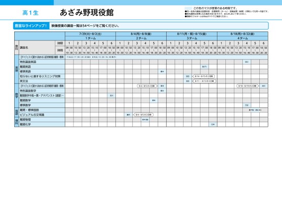 高1生あざみ野現役館豊富なラインアップ!映像授業の講座一覧は54ページをご覧ください。この色のマスが授業のある時限です。●同一名称の講座は設置校舎・設置期間(ターム)・授業時間(時限)が異なっても同一内容です。●担当講師は変更になる場合がありますので、あらかじめご了承ください。●講師のフルネームはWebサイトでご確認ください。7/29(火)~8/2(土)1ターム431256128/4(月)~8/8(金)2ターム438/11(月・祝)~8/15(金)8/18(月)~8/22(金)56123ターム4356124ターム435609:0010:5013:2015:1017:0018:5009:0010:5013:2015:1017:0018:5009:0010:5013:2015:1017:0018:5009:0010:5013:2015:1017:0018:50〜〜〜〜〜〜〜〜〜〜〜〜〜10:3012:2014:5016:4018:3020:2010:3012:2014:5016:4018:3020:2010:3012:2014:5016:4018:3020:2010:3012:2014:5016:4018:3020:20〜〜〜〜〜〜〜〜〜〜〜7/26(土)17:00〜20:20田口8/9(土)13:20〜16:40森(千)鏑木塚本國分8/4・8/5の2日間塚本流川森(千)吉田吉田8/14・8/15の2日間8/11〜8/13の3日間鹿内8/4・8/5の2日間鈴木(誠)臼井田口8/18・8/19の2日間流川古谷鹿子島・清水(め)時限時間講座名教科【ダイジェスト】夏から始める入試対策英語(難関・標準)特別選抜英語難関英語標準英語知らないと損するリスニング対策英文法【ダイジェスト】夏から始める入試対策数学(難関・標準)特別選抜数学難関数学中高一貫-アドバンスト(速習)-難関数学標準数学難関・標準国語ビジュアル古文常識難関物理難関化学英語数学国語理科