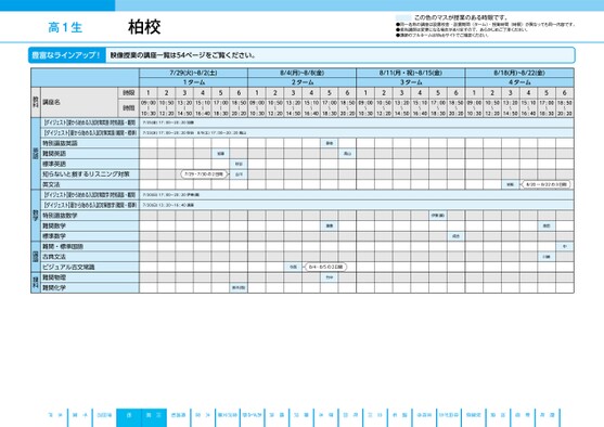 ●2025年度/夏期講習/東日本/川越/高1生/パターン34602025_56_3_333_31_20250328105147.csv/1ページ校了時削除この色のマスが授業のある時限です。●同一名称の講座は設置校舎・設置期間(ターム)・授業時間(時限)が異なっても同一内容です。●担当講師は変更になる場合がありますので、あらかじめご了承ください。●講師のフルネームはWebサイトでご確認ください。高1生柏校7/29(火)~8/2(土)1ターム431256128/4(月)~8/8(金)2ターム438/11(月・祝)~8/15(金)8/18(月)~8/22(金)56123ターム4356124ターム435609:0010:5013:2015:1017:0018:5009:0010:5013:2015:1017:0018:5009:0010:5013:2015:1017:0018:5009:0010:5013:2015:1017:0018:50〜〜〜〜〜〜〜〜〜〜〜〜〜10:3012:2014:5016:4018:3020:2010:3012:2014:5016:4018:3020:2010:3012:2014:5016:4018:3020:2010:3012:2014:5016:4018:3020:20〜〜〜〜〜〜〜〜〜〜〜7/25(金)17:00〜20:20加藤7/23(水)17:00〜20:20秋谷8/9(土)17:00〜20:20高山加藤7/29・7/30の2日間秋谷山川7/20(日)17:00〜20:20伊東(鋼)7/20(日)13:20〜16:40遠藤是枝高山遠藤今西8/4・8/5の2日間竹中鈴木(翔)伊東(鋼)成合岩舩8/20〜8/22の3日間島田川崎中時限時間講座名教科【ダイジェスト】夏から始める入試対策英語(特別選抜・難関)【ダイジェスト】夏から始める入試対策英語(難関・標準)特別選抜英語難関英語標準英語知らないと損するリスニング対策英文法【ダイジェスト】夏から始める入試対策数学(特別選抜・難関)【ダイジェスト】夏から始める入試対策数学(難関・標準)特別選抜数学難関数学標準数学難関・標準国語古典文法ビジュアル古文常識難関物理難関化学英語数学国語理科豊富なラインアップ!映像授業の講座一覧は54ページをご覧ください。水戸千葉津田沼柏川越南浦和大宮金沢文庫あざみ野横浜藤沢厚木町田立川調布吉祥寺自由が丘秋葉原池袋新宿麹町