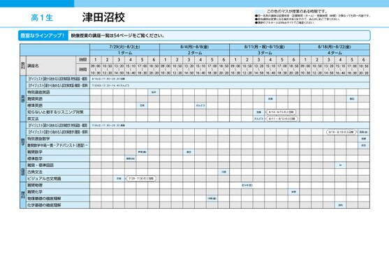 高1生津田沼校豊富なラインアップ!映像授業の講座一覧は54ページをご覧ください。この色のマスが授業のある時限です。●同一名称の講座は設置校舎・設置期間(ターム)・授業時間(時限)が異なっても同一内容です。●担当講師は変更になる場合がありますので、あらかじめご了承ください。●講師のフルネームはWebサイトでご確認ください。7/29(火)~8/2(土)1ターム431256128/4(月)~8/8(金)2ターム438/11(月・祝)~8/15(金)8/18(月)~8/22(金)56123ターム4356124ターム435609:0010:5013:2015:1017:0018:5009:0010:5013:2015:1017:0018:5009:0010:5013:2015:1017:0018:5009:0010:5013:2015:1017:0018:50〜〜〜〜〜〜〜〜〜〜〜〜〜10:3012:2014:5016:4018:3020:2010:3012:2014:5016:4018:3020:2010:3012:2014:5016:4018:3020:2010:3012:2014:5016:4018:3020:20〜〜〜〜〜〜〜〜〜〜〜8/16(土)17:00〜20:20加藤7/20(日)13:20〜16:40えんどう桜井日髙えんどう7/26(土)17:00〜20:20遠藤伊東(鋼)島田高梨(由)平賀7/29・7/30の2日間加藤藤田加藤8/14・8/15の2日間えんどう8/11〜8/13の3日間川崎佐々木(哲)中野(健)安東8/18・8/19の2日間高梨(由)遠藤成合中浅利時限時間講座名教科【ダイジェスト】夏から始める入試対策英語(特別選抜・難関)【ダイジェスト】夏から始める入試対策英語(難関・標準)特別選抜英語難関英語標準英語知らないと損するリスニング対策英文法【ダイジェスト】夏から始める入試対策数学(特別選抜・難関)【ダイジェスト】夏から始める入試対策数学(難関・標準)特別選抜数学難関数学中高一貫-アドバンスト(速習)-難関数学標準数学難関・標準国語古典文法ビジュアル古文常識難関物理難関化学物理基礎の徹底理解化学基礎の徹底理解英語数学国語理科