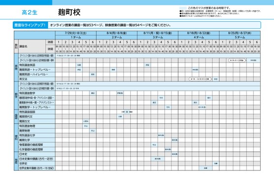 高2生麹町校この色のマスが授業のある時限です。●同一名称の講座は設置校舎・設置期間(ターム)・授業時間(時限)が異なっても同一内容です。●担当講師は変更になる場合がありますので、あらかじめご了承ください。●講師のフルネームはWebサイトでご確認ください。豊富なラインアップ!オンライン授業の講座一覧は53ページ、映像授業の講座一覧は54ページをご覧ください。7/29(火)~8/2(土)8/4(月)~8/8(金)8/11(月・祝)~8/15(金)8/18(月)~8/22(金)8/25(月)~8/27(水)1ターム431256122ターム4356123ターム4356124ターム4356125ターム435609:0010:5013:2015:1017:0018:5009:0010:5013:2015:1017:0018:5009:0010:5013:2015:1017:0018:5009:0010:5013:2015:1017:0018:5009:0010:5013:2015:1017:0018:50〜〜〜〜〜〜〜〜〜〜〜〜〜〜〜〜〜〜〜〜〜〜〜〜〜〜〜〜〜〜10:3012:2014:5016:4018:3020:2010:3012:2014:5016:4018:3020:2010:3012:2014:5016:4018:3020:2010:3012:2014:5016:4018:3020:2010:3012:2014:5016:4018:3020:207/26(土)17:00〜20:20青柳佐藤押田8/16(土)17:00〜20:20郷田8/9(土)17:00〜20:20竹内是枝郷田小野木杉山杉山青柳木村(智)押田8/25の1日完結木村(智)8/18〜8/20の3日間秋谷竹内渡辺竹内夏川成合佐々木(吾)伊東(敦)川野・園・豊崎川野鈴木(翔)杉山坂本(勝)鈴木(翔)鈴木(翔)坂本(勝)加藤加藤時限時間講座名教科【ダイジェスト】夏から始める入試対策英語(特別選抜・難関)【ダイジェスト】夏から始める入試対策英語(難関・標準)特別選抜英語難関英語-トップレベル-難関英語-ハイレベル-英文法【ダイジェスト】夏から始める入試対策数学(特別選抜・難関)【ダイジェスト】夏から始める入試対策数学(難関・標準)特別選抜数学難関理系数学中高一貫-アドバンスト(速習)-難関数学中高一貫-アドバンスト-難関数学-トップレベル-特別選抜国語難関現代文難関古文特別選抜物理難関物理特別選抜化学難関化学物理基礎の徹底理解化学基礎の徹底理解日本史日本史集中講義(古代―近世)世界史世界史集中講義(古代―18世紀)英語数学国語理科地歴