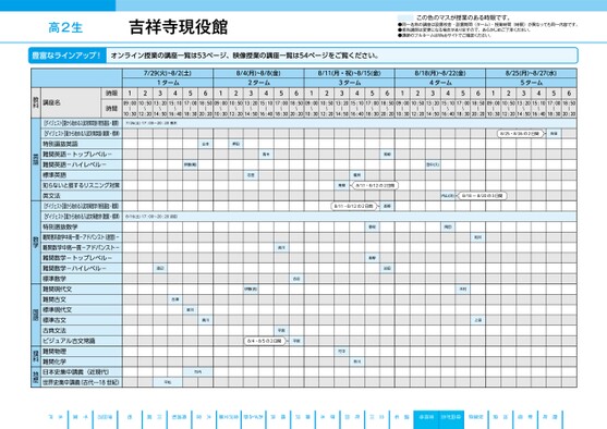 ●2025年度/夏期講習/東日本/自由が丘/高2生/パターン35602025_56_3_337_32_20250331100846.csv/1ページ校了時削除この色のマスが授業のある時限です。●同一名称の講座は設置校舎・設置期間(ターム)・授業時間(時限)が異なっても同一内容です。●担当講師は変更になる場合がありますので、あらかじめご了承ください。●講師のフルネームはWebサイトでご確認ください。高2生吉祥寺現役館7/29(火)~8/2(土)8/4(月)~8/8(金)8/11(月・祝)~8/15(金)8/18(月)~8/22(金)8/25(月)~8/27(水)1ターム431256122ターム4356123ターム4356124ターム4356125ターム435609:0010:5013:2015:1017:0018:5009:0010:5013:2015:1017:0018:5009:0010:5013:2015:1017:0018:5009:0010:5013:2015:1017:0018:5009:0010:5013:2015:1017:0018:50〜〜〜〜〜〜〜〜〜〜〜〜〜〜〜〜〜〜〜〜〜〜〜〜10:3012:2014:5016:4018:3020:2010:3012:2014:5016:4018:3020:2010:3012:2014:5016:4018:3020:2010:3012:2014:5016:4018:3020:2010:3012:2014:5016:4018:3020:20〜〜〜〜〜〜山本押田伊藤(剛)青木吉田7/26(土)17:00〜20:20青木8/16(土)17:00〜20:20迫田流川古谷伊藤(武)平賀8/4・8/5の2日間平賀渡辺吉澤絵川貴川竹内平松8/25・8/26の2日間吉田青柳田中(久)礒貝青柳8/11・8/12の2日間8/11・8/12の2日間長野香坂長野迫田竹中早川内山(洋)8/18〜8/20の3日間岡田相川木村上田時限時間講座名教科【ダイジェスト】夏から始める入試対策英語(特別選抜・難関)【ダイジェスト】夏から始める入試対策英語(難関・標準)特別選抜英語難関英語-トップレベル-難関英語-ハイレベル-標準英語知らないと損するリスニング対策英文法【ダイジェスト】夏から始める入試対策数学(特別選抜・難関)【ダイジェスト】夏から始める入試対策数学(難関・標準)特別選抜数学難関理系数学中高一貫-アドバンスト(速習)-難関数学中高一貫-アドバンスト-難関数学-トップレベル-難関数学-ハイレベル-標準数学難関現代文難関古文標準現代文標準古文古典文法ビジュアル古文常識難関物理難関化学日本史集中講義(近現代)世界史集中講義(古代―18世紀)英語数学国語理科地歴豊富なラインアップ!オンライン授業の講座一覧は53ページ、映像授業の講座一覧は54ページをご覧ください。水戸千葉津田沼柏川越南浦和大宮金沢文庫あざみ野横浜藤沢厚木町田立川調布吉祥寺自由が丘秋葉原池袋新宿麹町