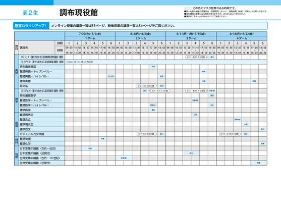 高2生調布現役館この色のマスが授業のある時限です。●同一名称の講座は設置校舎・設置期間(ターム)・授業時間(時限)が異なっても同一内容です。●担当講師は変更になる場合がありますので、あらかじめご了承ください。●講師のフルネームはWebサイトでご確認ください。豊富なラインアップ!オンライン授業の講座一覧は53ページ、映像授業の講座一覧は54ページをご覧ください。7/29(火)~8/2(土)1ターム431256128/4(月)~8/8(金)2ターム438/11(月・祝)~8/15(金)8/18(月)~8/22(金)56123ターム4356124ターム435609:0010:5013:2015:1017:0018:5009:0010:5013:2015:1017:0018:5009:0010:5013:2015:1017:0018:5009:0010:5013:2015:1017:0018:50〜〜〜〜〜〜〜〜〜〜〜〜〜10:3012:2014:5016:4018:3020:2010:3012:2014:5016:4018:3020:2010:3012:2014:5016:4018:3020:2010:3012:2014:5016:4018:3020:20〜〜〜〜〜〜〜〜〜〜〜7/26(土)15:10〜18:30内山(洋)村内山(洋)松野8/11・8/12の2日間青木青木大島8/4〜8/6の3日間吉田窪田8/6・8/7の2日間8/13・8/14の2日間佐藤(健)高梨(大)窪田岡田流川佐藤(健)川野8/7・8/8の2日間貴川8/18・8/19の2日間貴川酒井(完)大窪宇都安部平尾(雅)西川尾崎貴川安東斉藤時限時間講座名教科【ダイジェスト】夏から始める入試対策英語(特別選抜・難関)【ダイジェスト】夏から始める入試対策英語(難関・標準)特別選抜英語難関英語-トップレベル-難関英語-ハイレベル-標準英語英文法【ダイジェスト】夏から始める入試対策数学(難関・標準)特別選抜数学難関数学-トップレベル-難関数学-ハイレベル-標準数学難関現代文難関古文標準現代文標準古文ビジュアル古文常識難関物理難関化学日本史集中講義(古代―近世)日本史集中講義(近現代)世界史集中講義(古代―18世紀)世界史集中講義(近現代)英語数学国語理科地歴